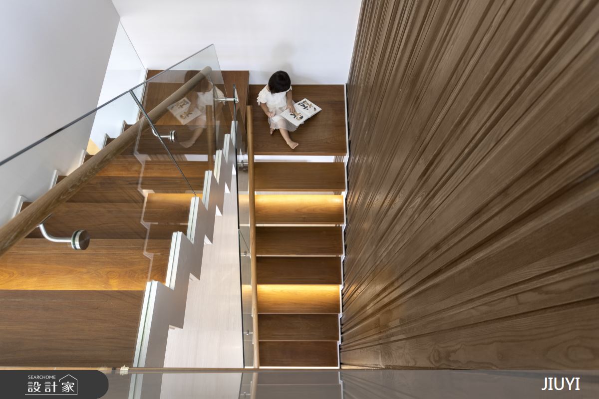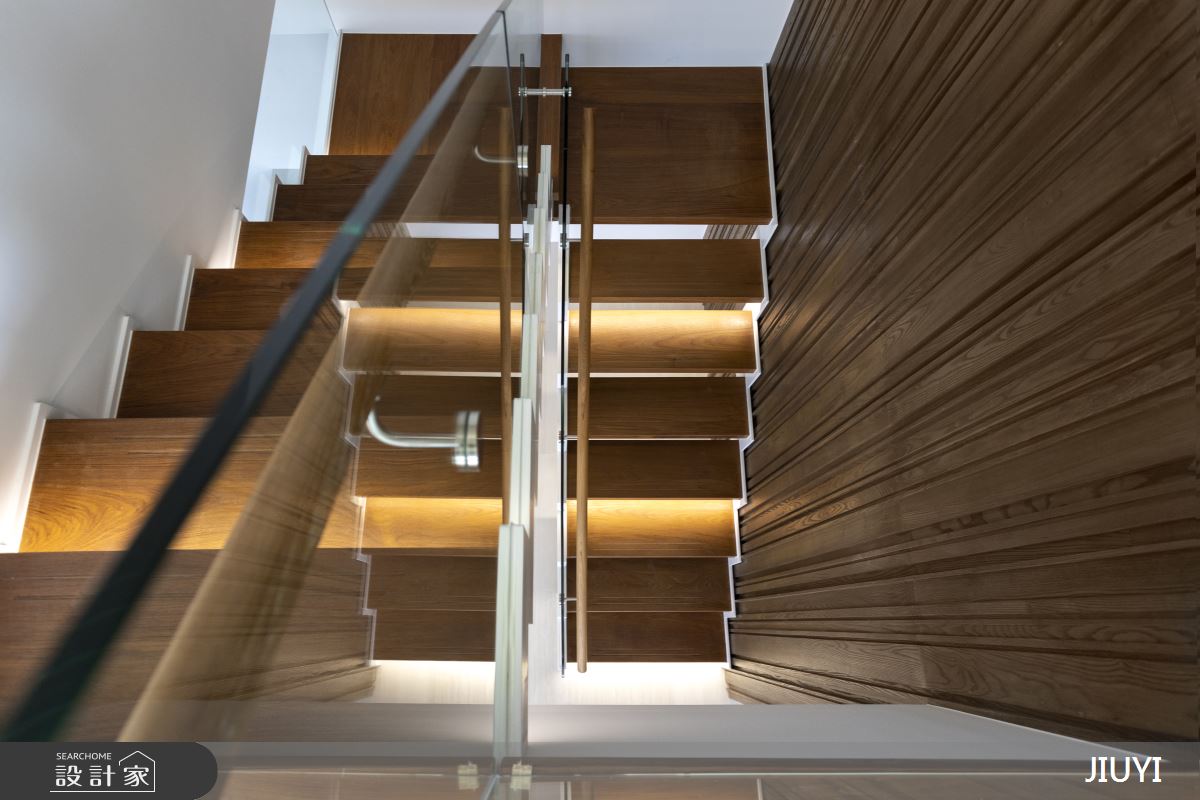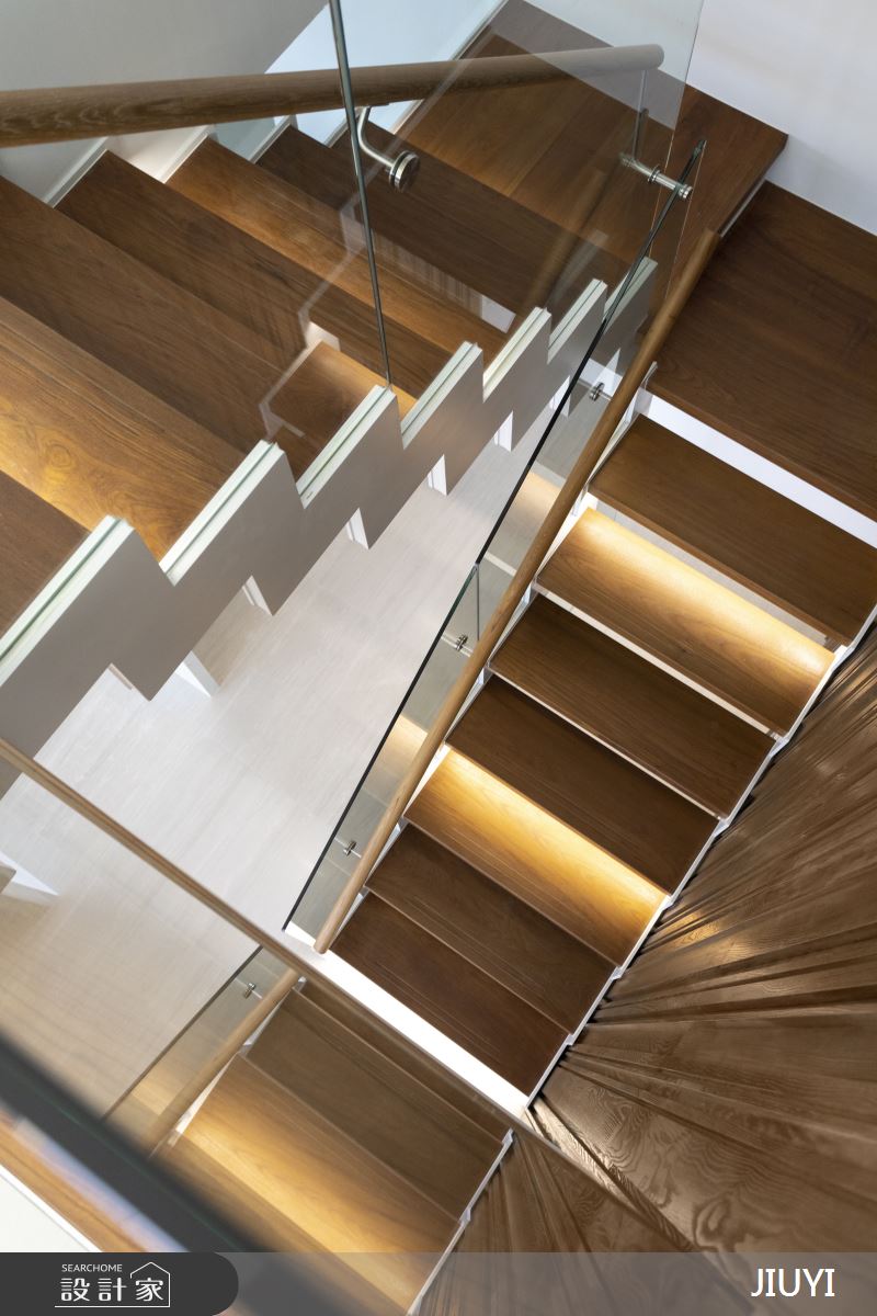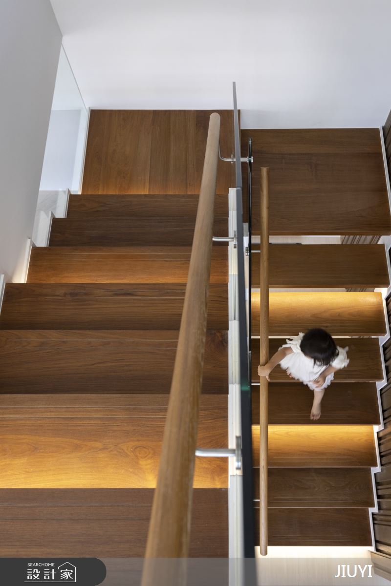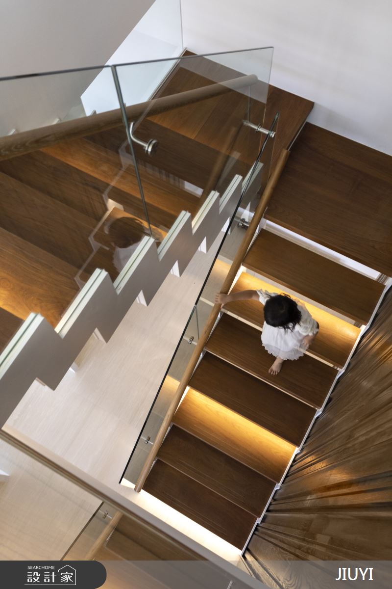 透明的玻璃扶手護欄搭配梯面下方的隱藏光帶營造清透調性,也呼應整體空間的明亮感。