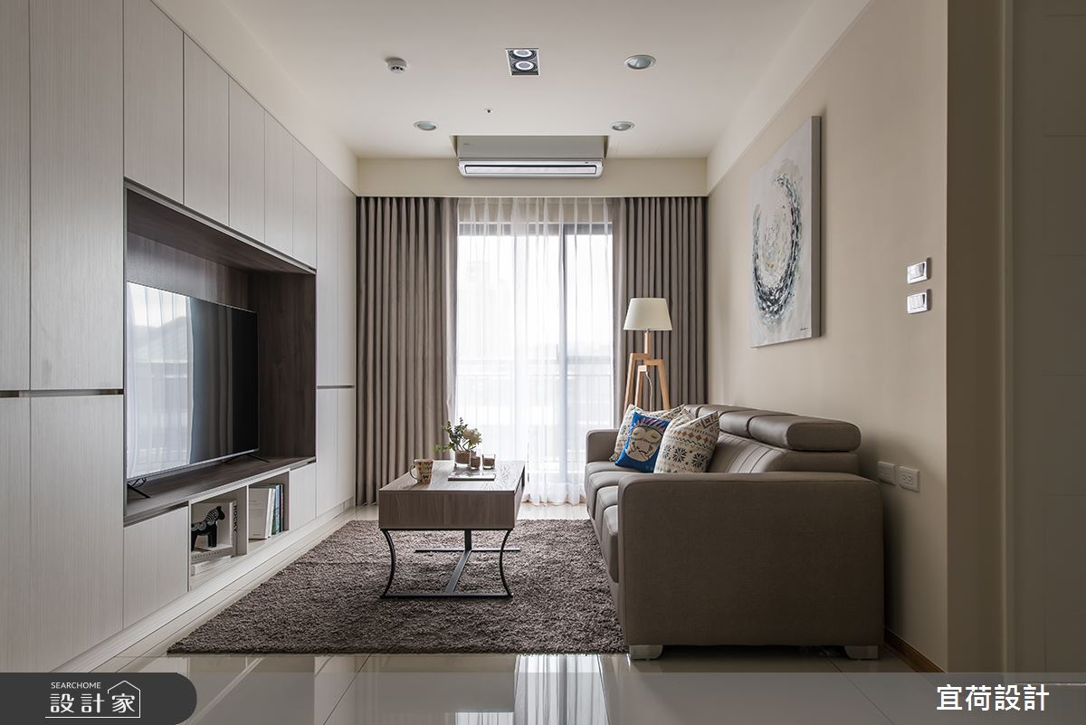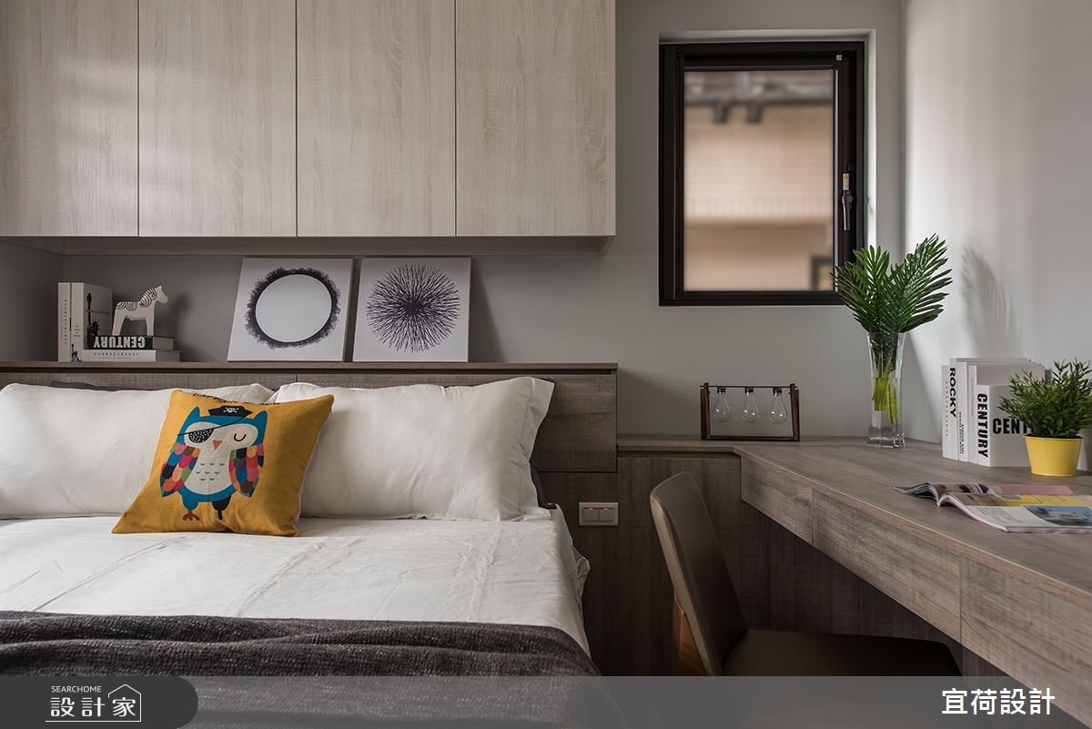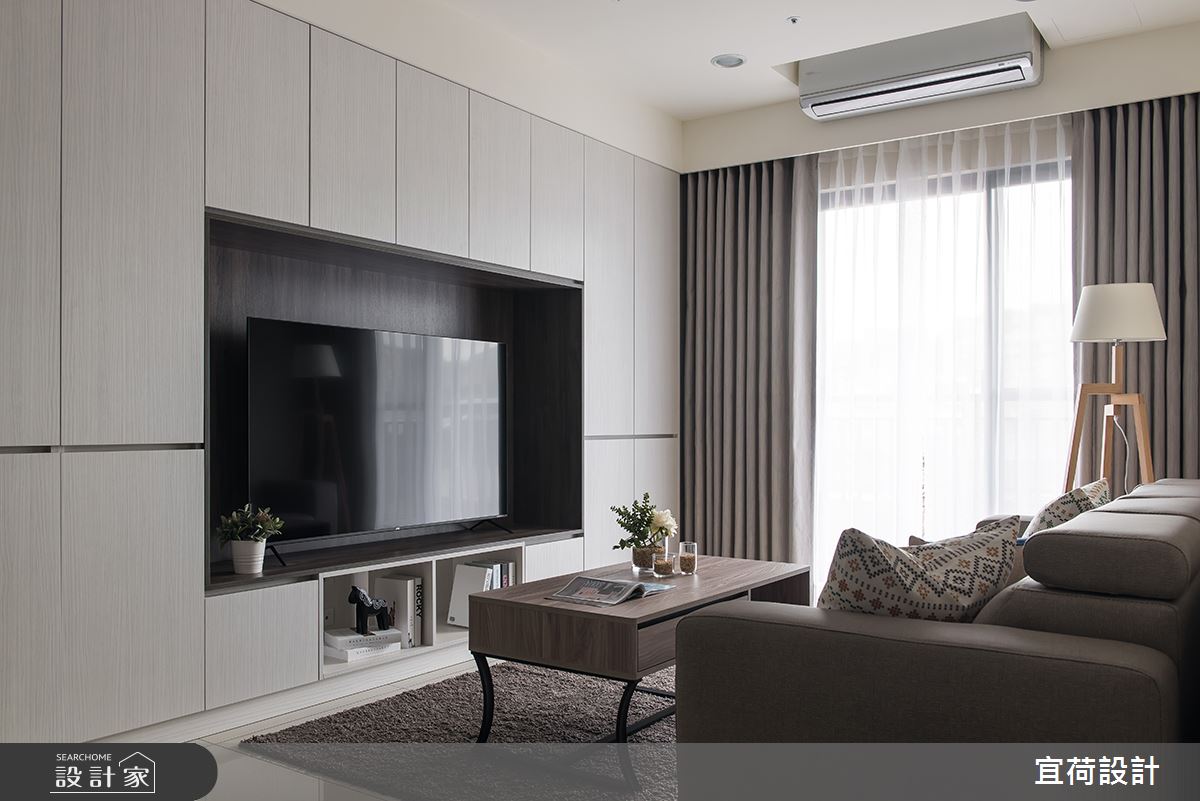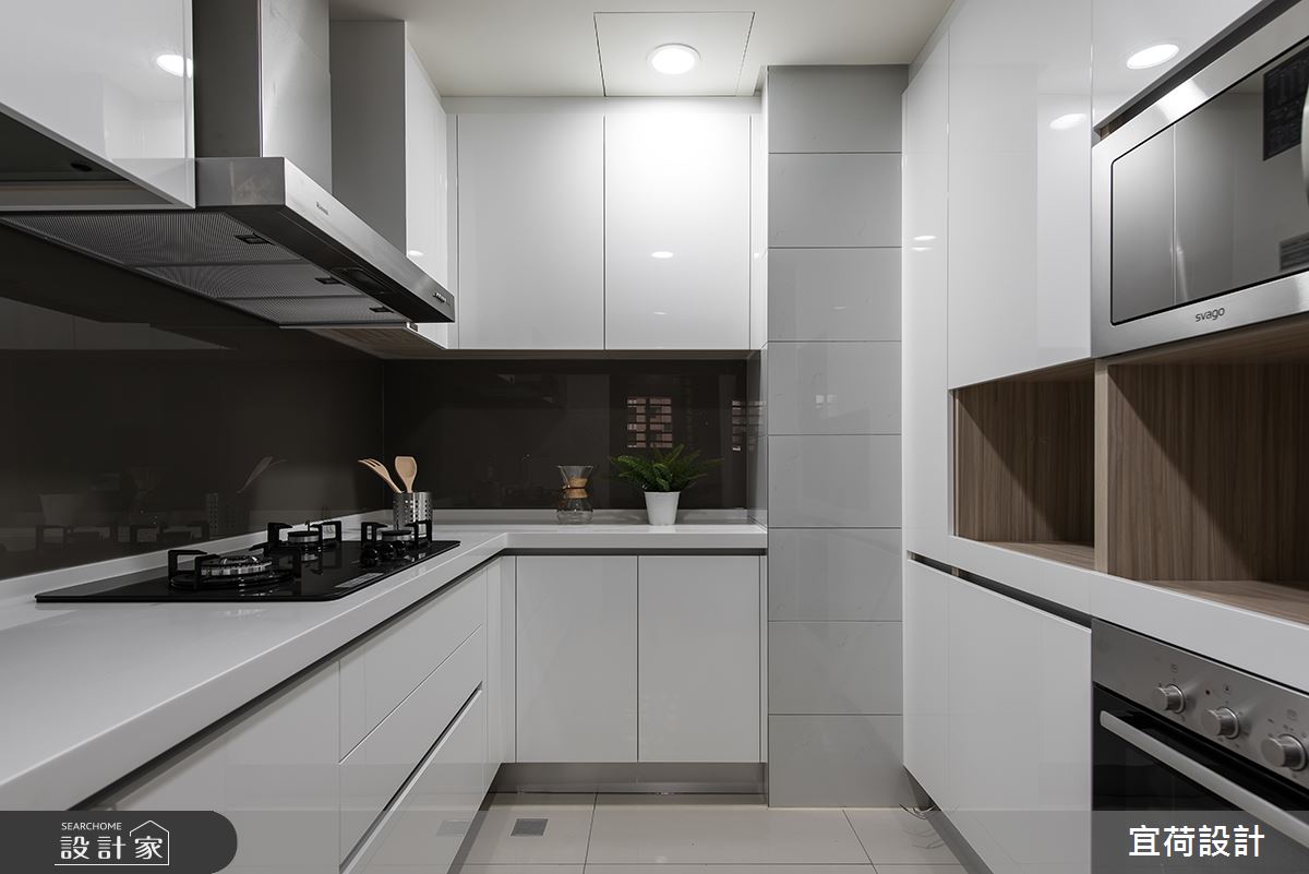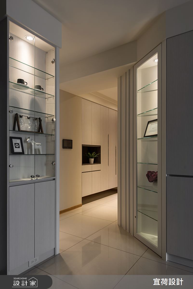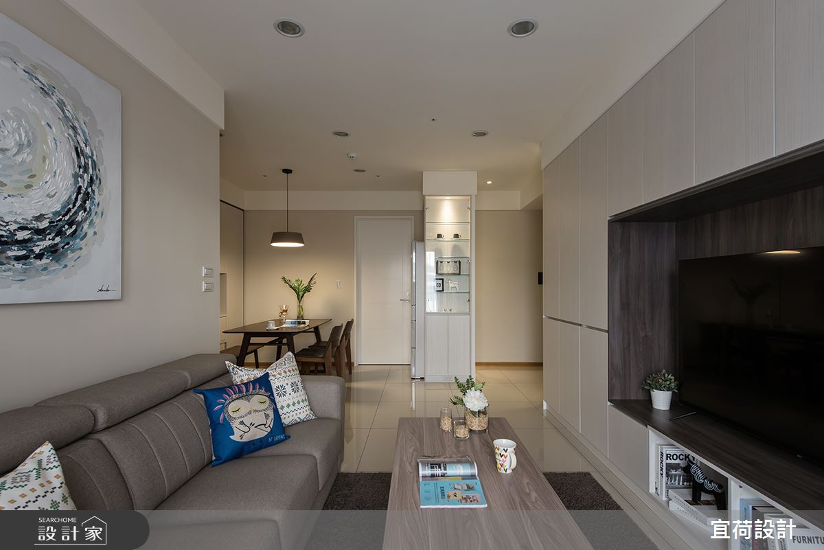 原格局的開放式設計,讓用餐區較沒有隱私,於是改變原廚房入口位置新增電器收納櫃,賦予玄關底端屏風機能;步入室內前運用的45度客製化轉角收納,順暢動線帶來開闊感受,還成為收藏品的最佳展示舞台。杏色調的客、餐廳,運用系統櫃的多元性替電視牆、餐廳區規劃大容量隱藏收納,簡約寬敞視覺中暗藏豐富儲物規劃。獨立廚房入口更改位置後,也將一字型廚具設備變更為擁有備餐區的 L 型廚房,打造更適合屋主需求的設計。