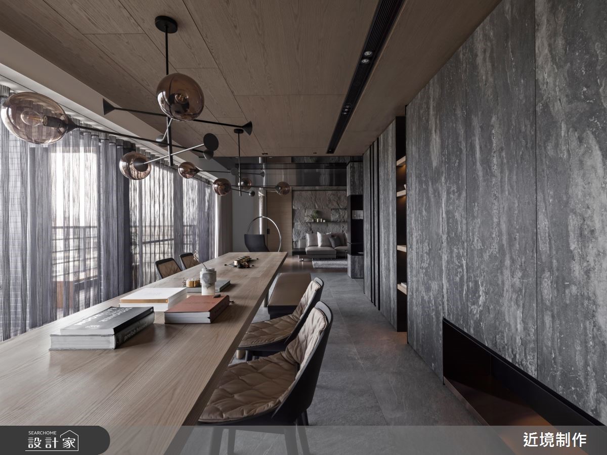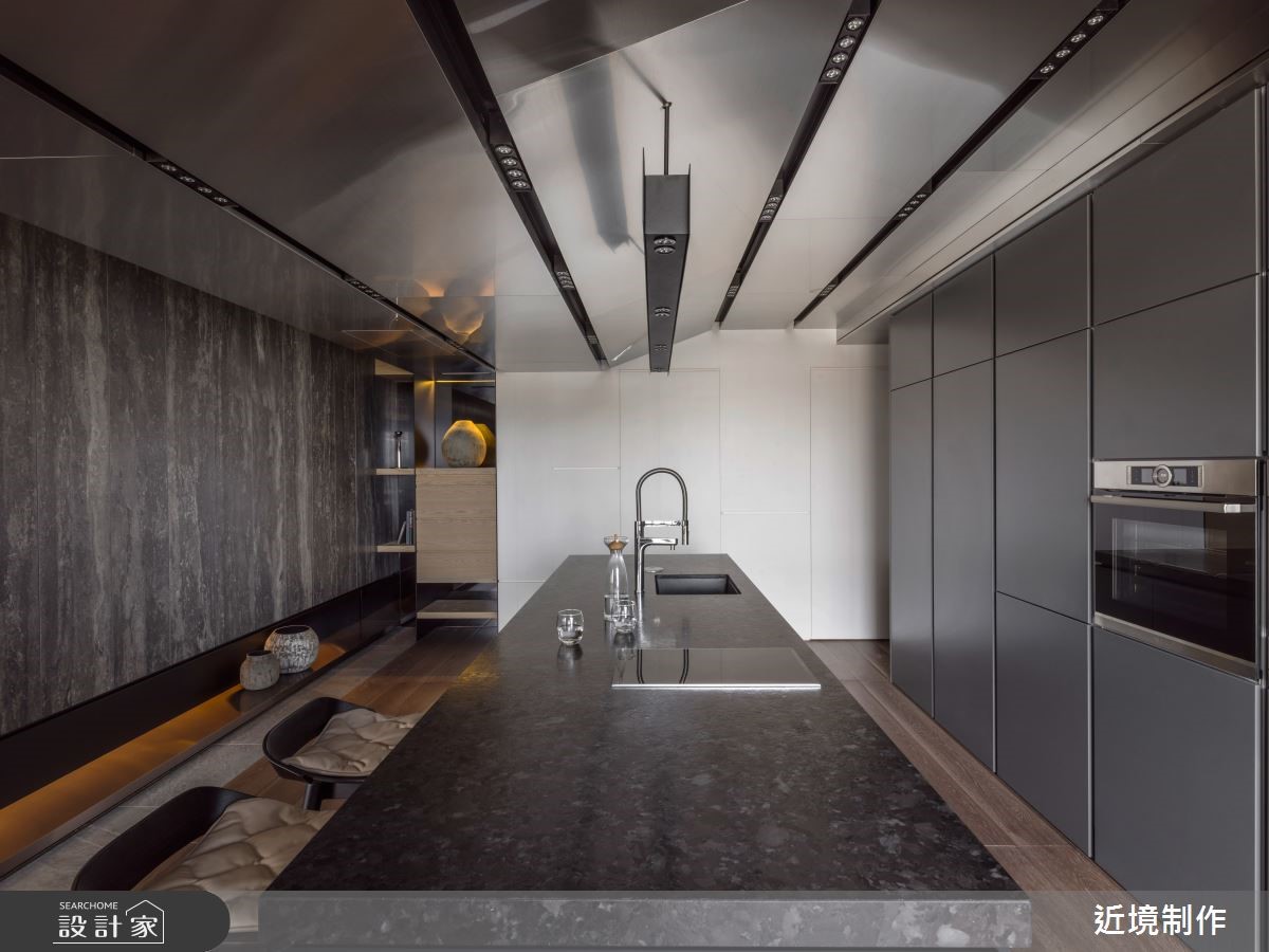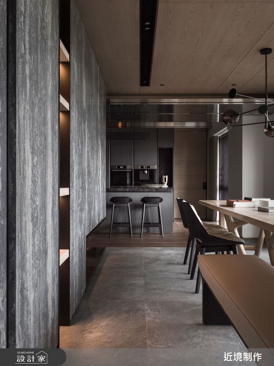 餐廳旁側的開放式中島廚房,以石皮貼附牆面,和灰色的廚具相互呼應,突顯空間個性。為修飾大樑之故,此區天花板經由修飾,呈現強烈的視覺感受,使得整體空間沉穩內斂、特色獨具。