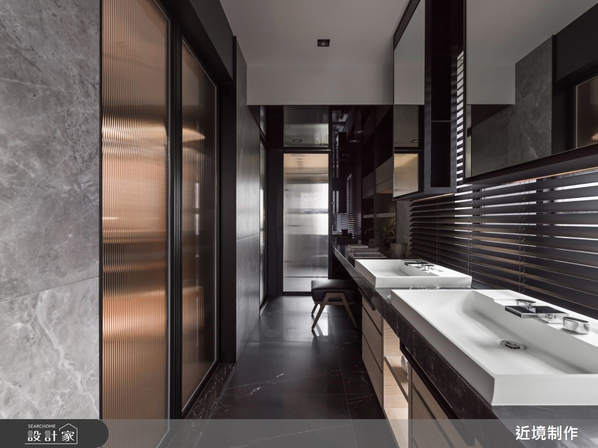 在66坪的新成屋中,為求將家人的生活模式及作息順暢連結,特意強化格局配置。因為雙拼格局形成的狹長空間,以擁有大長桌的餐廳做為空間中心,這裡坐擁最優異的採光,使室內充滿舒適的明亮度,作為這個家給人的第一印象。客廳則歸總於進門處的右側,沙發背牆選用了鑿刻粗獷的觀音石,突顯層次特色,而客廳後方則為機能完善的主臥室,藉由突破性的動線規劃,打散主浴室的格局配置,並以一座非常大的盥洗檯面,延續整格套房的空間尺度。