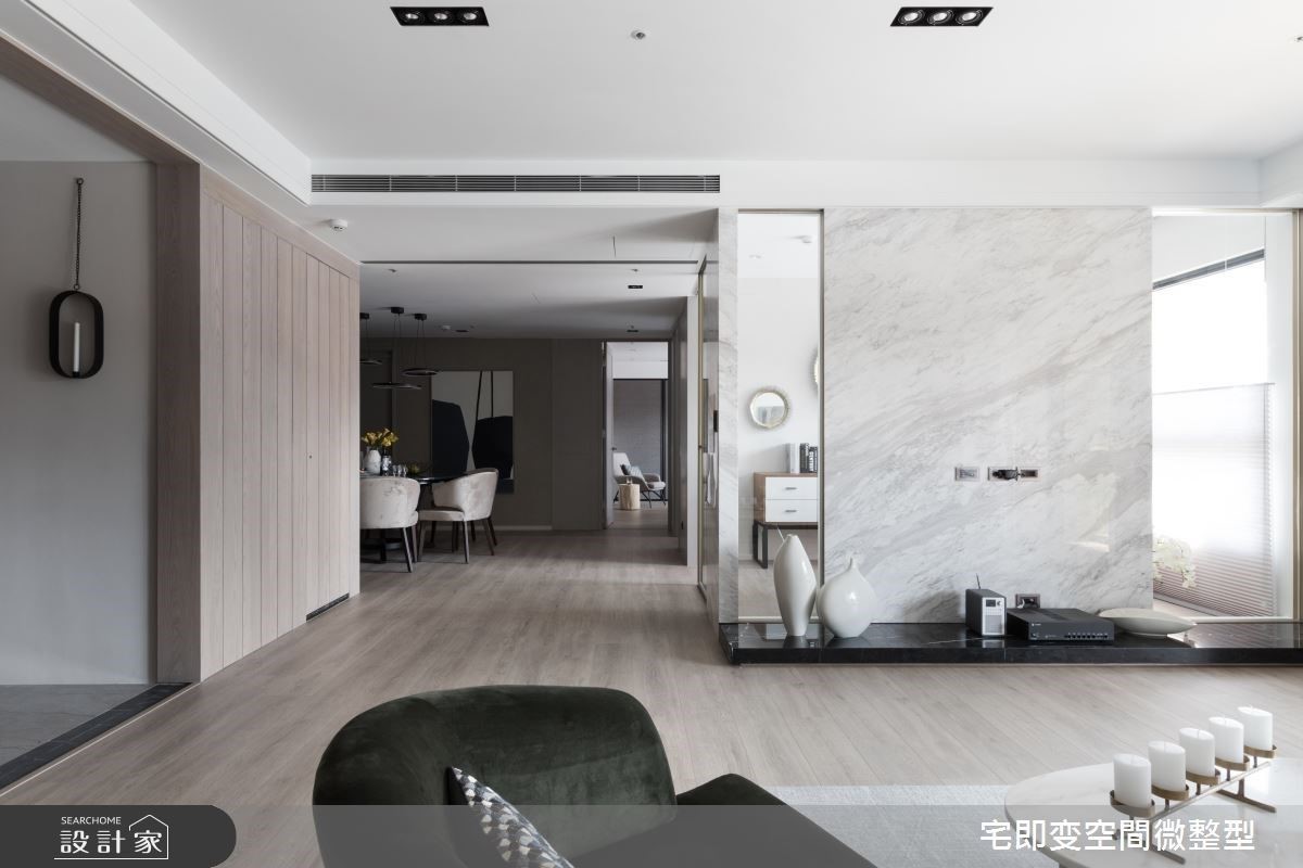 重視動線、建材、收納與風格四大主軸的朱俞君設計師,以女人細膩心思,及自身裝修經驗的積累,在 75 坪空間中,運用超耐磨木地板、系統板材、石材等材質,突破以往對實品屋的既定印象,打造集品味、美感於一身的現代宅邸,更為居住者帶來最貼心便利的生活體悟。