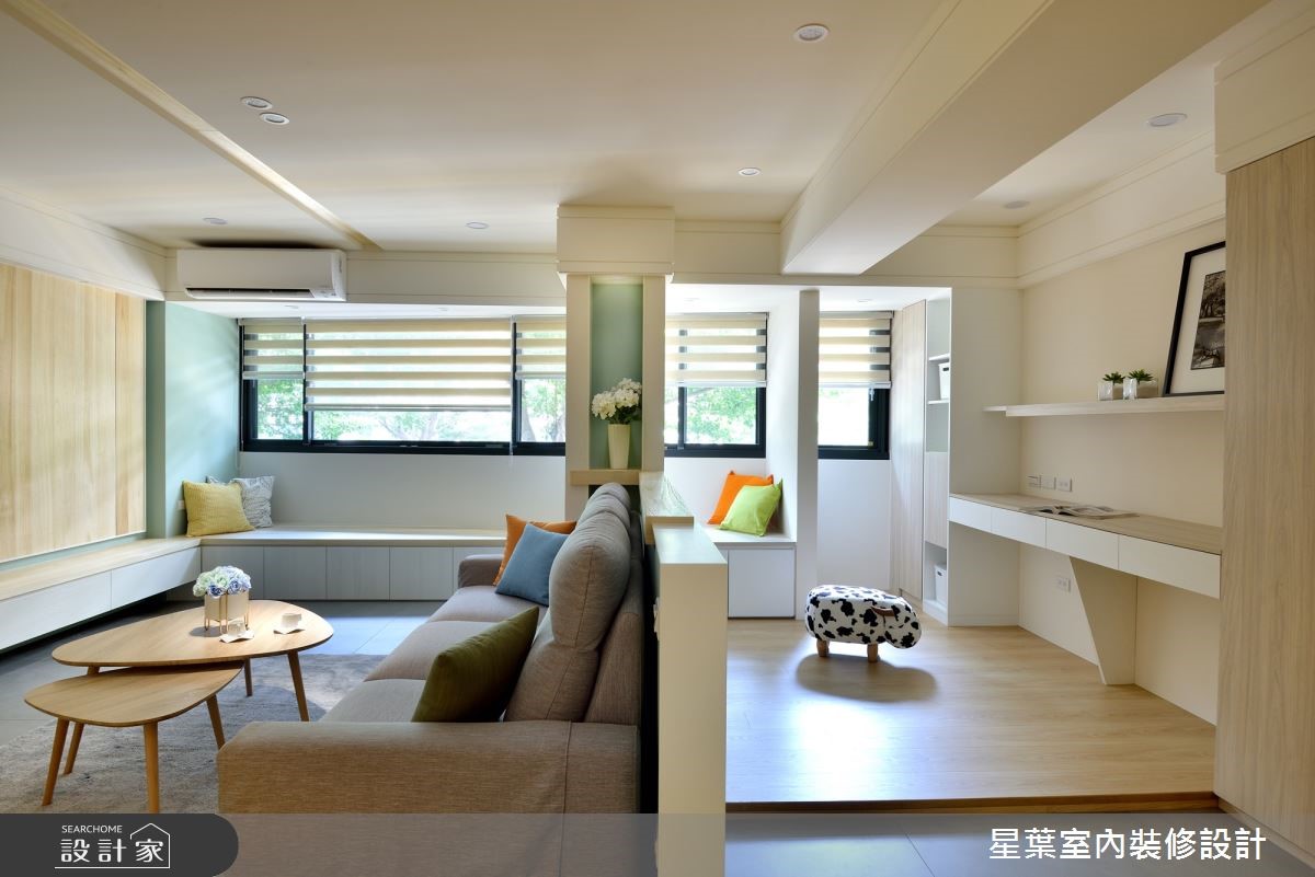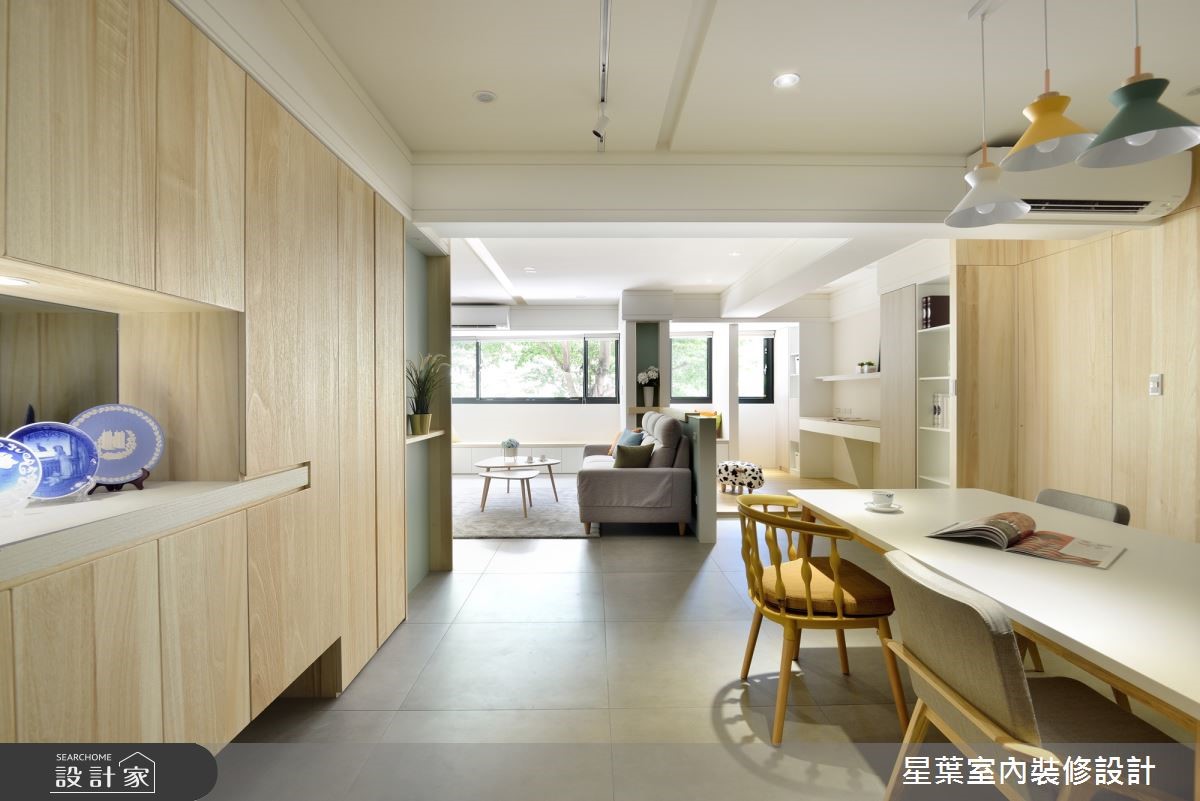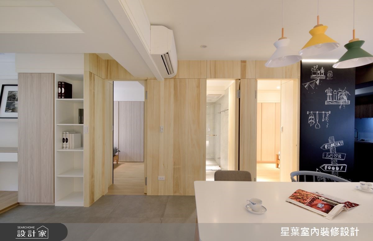公領域首先將廚房、書房牆線打開,改善空間格局及採光缺陷。書房與客廳之間予以半牆設計,迎來無邊際的寬敞視覺,光線得以自然流竄於室內,且透過新增的日光小臥榻,擴增座位數、打造愜意園地,也讓公共空間成為凝聚家人情感互動的交流地帶;開放式餐廚空間規劃,透過新增的中島吧檯,串連廚房及餐廳區,日光不僅能照亮每個角落,也順暢了使用動線及機能。風格設計上,以大量的木質材鋪陳牆面、收納櫃體,傳遞溫馨北歐風生活感;並透過隱藏式門片設計,帶來簡練寬鬆的效果;餐廚區巧妙透過異材質黑板牆設計,增添生活風格、提升視覺層次,同時成為出入門留言板及菜單食譜隨手紀錄牆。