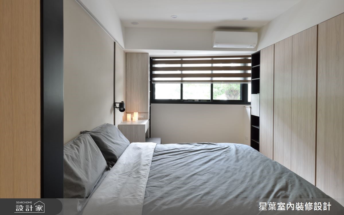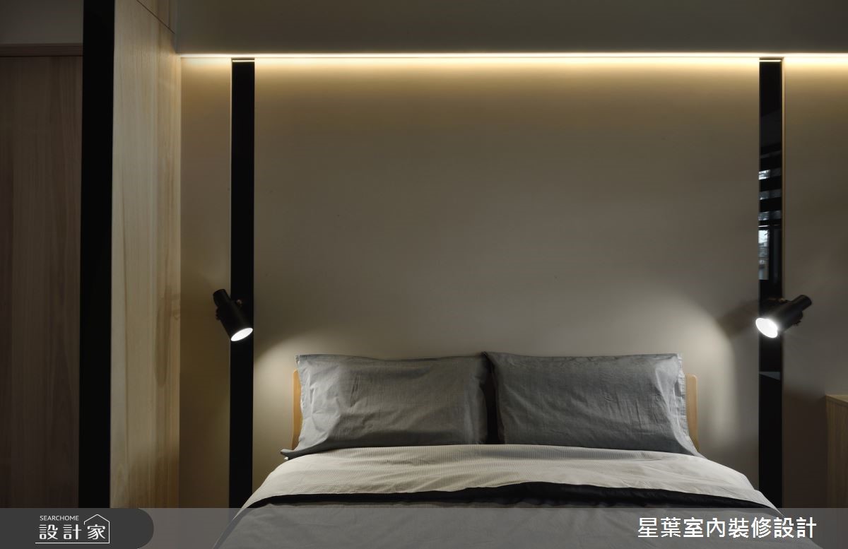 主臥以木質、杏色調床頭、溫馨的間接光氛與床頭打燈設計,延續公共空間的暖心氣氛,並把日光充足地帶留給梳妝台,不論梳妝、閱覽皆擁有舒適環境與光線。