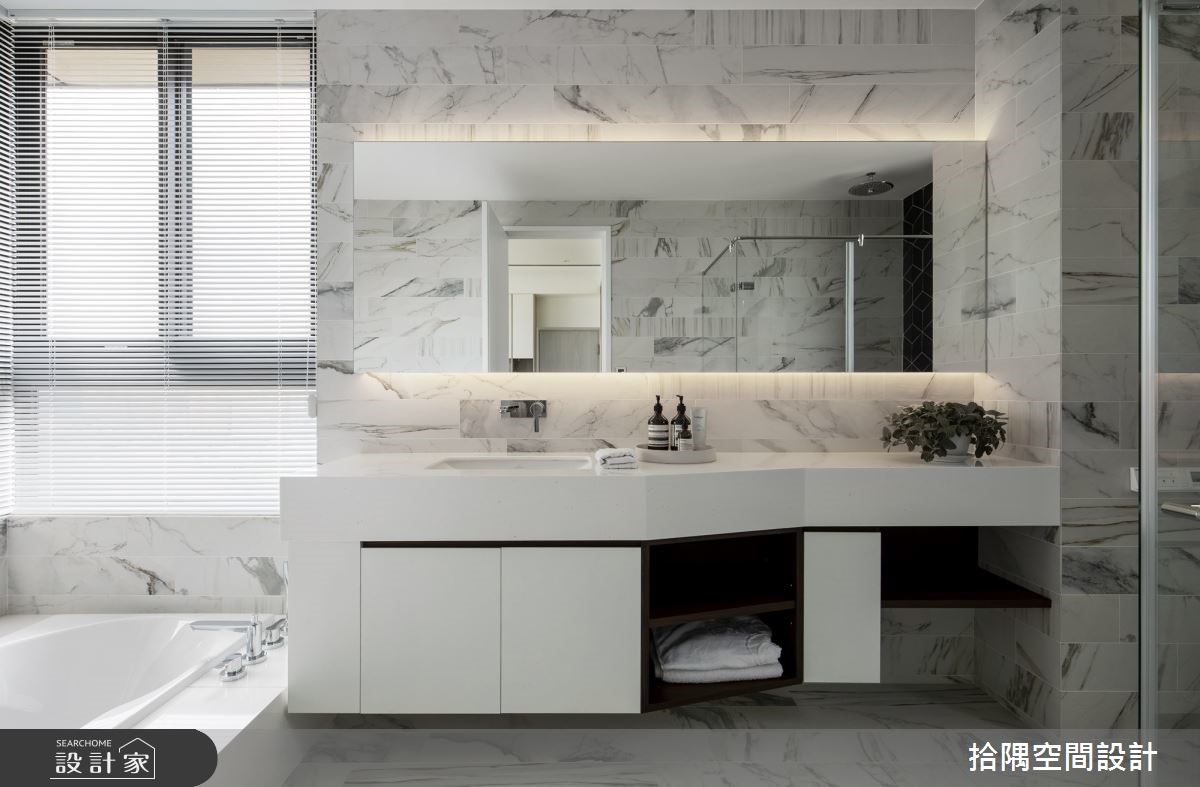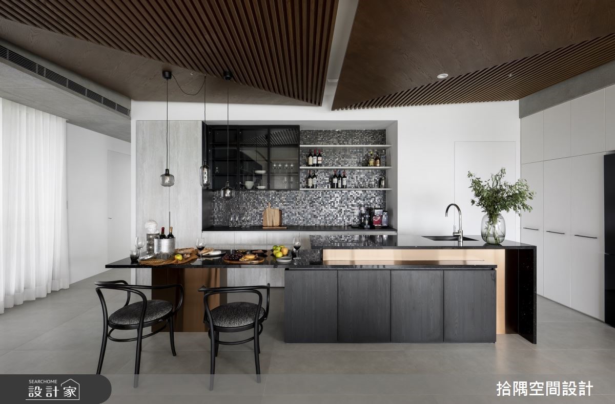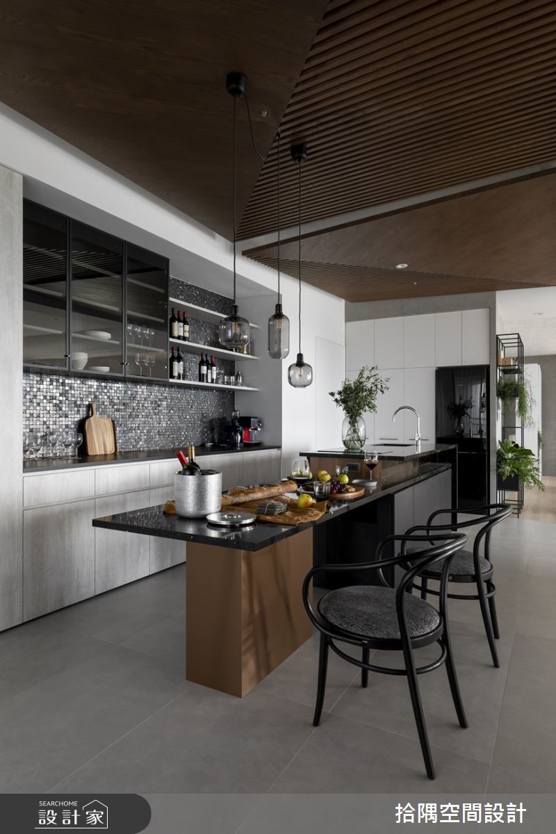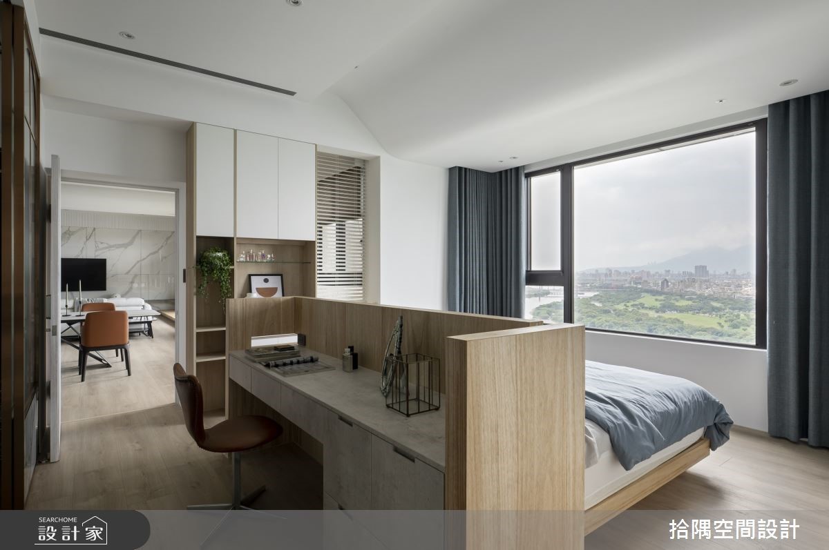 從大門進入後,灰白牆面上一束光線延伸至天花搭配鏤空側面白色柱體展示櫃,帶出空間設計感。而客廳則以淺色為基調,白色大理石牆面增添空間層次。窗邊的臥榻為室內外做連結,並兼具收納與座位的作用。臥榻延伸至落地窗,順勢下降與陽台水平,延攬室外風光。中島區天花則利用深褐色線條與折線展現利落的空間語彙,並透過局部的金屬色系聚焦視線。私領域則回歸最單純的睡眠品質,且延伸公領域與窗外連接的主軸,將床頭面向室外景色,而床頭櫃後方凹陷賦予書桌及化妝台功能,金屬拉門則隔出女主人的化妝櫃與更衣空間。