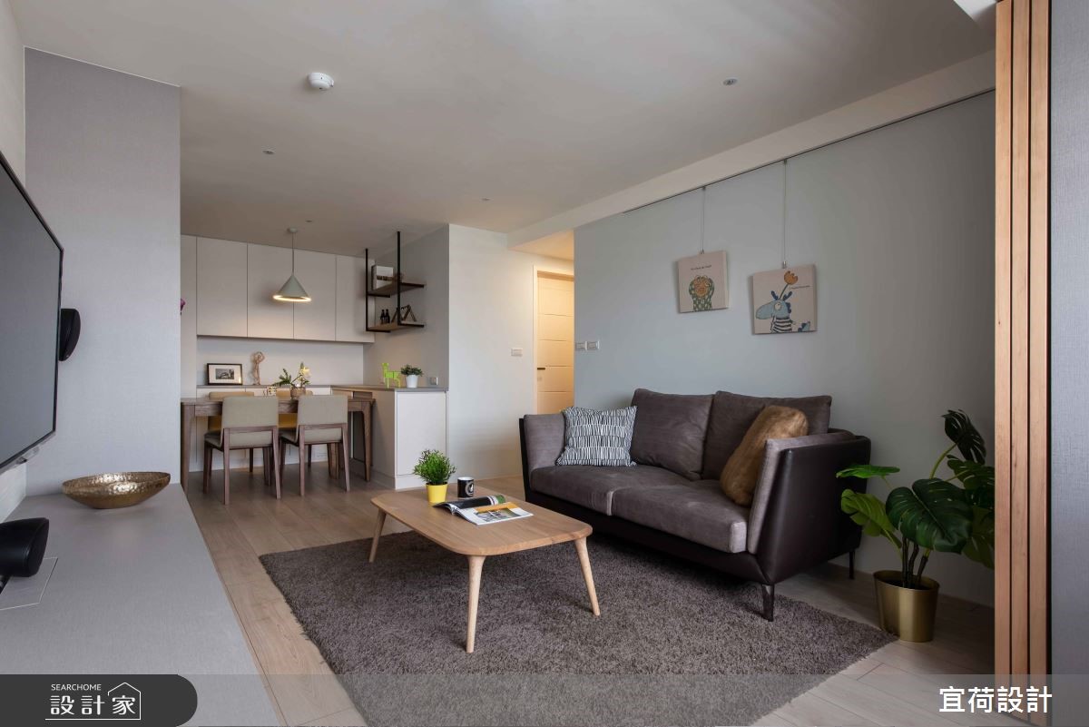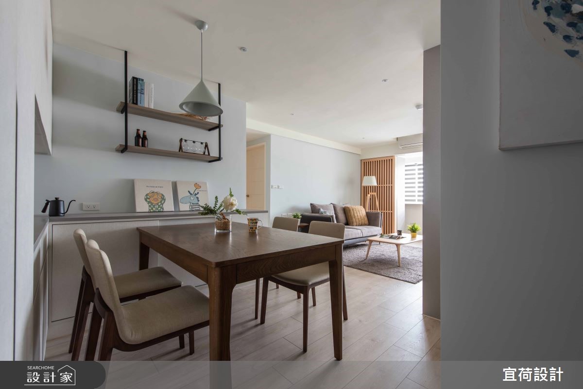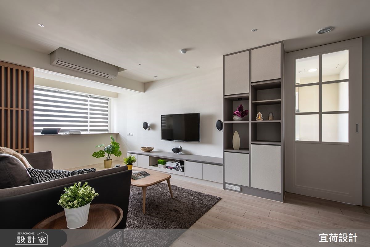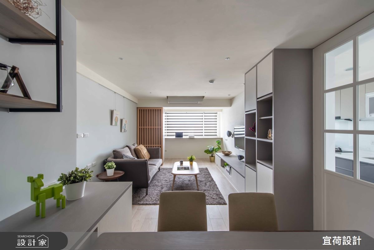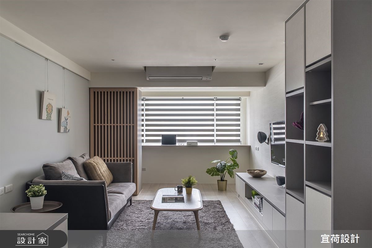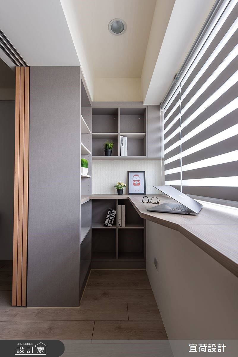 因為是老屋翻新,原來的客廳屋況較為特殊,考慮到沙發旁上方有一根大樑,於是順應格局,將公領域區隔成兩區,挪出獨立的工作空間,以隔柵門作界定區隔,帶入輕盈的輕日式風格,而原先客廳窗台的地方則予以加寬,透過吧台桌面的設置,創造明亮美好的閱讀角落,旁邊的畸零空間再多做出置物空間,可用以收納工作資料及書籍!