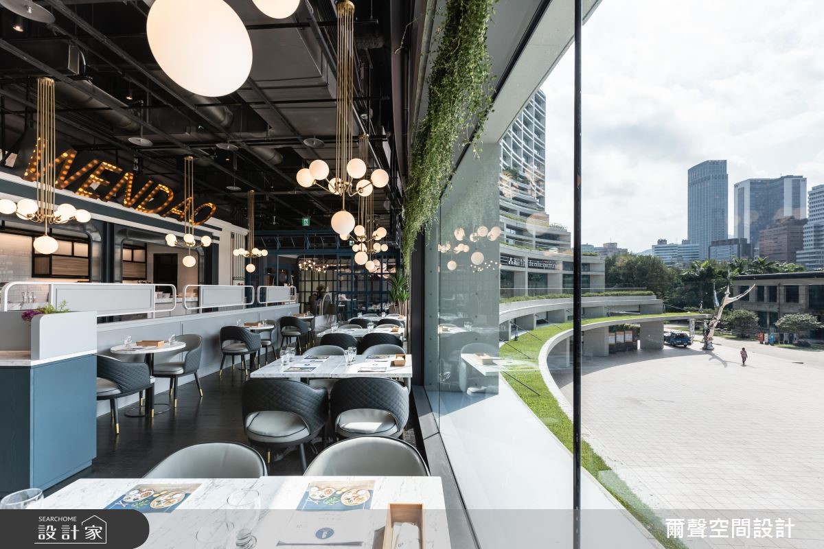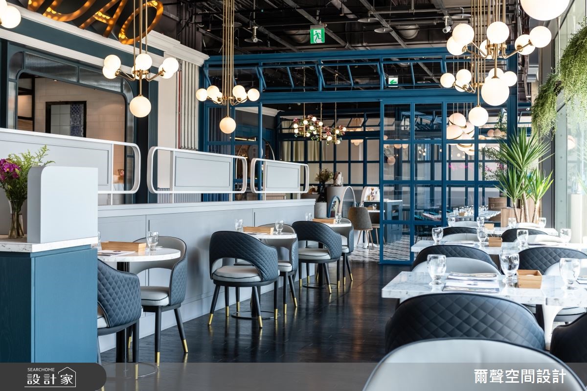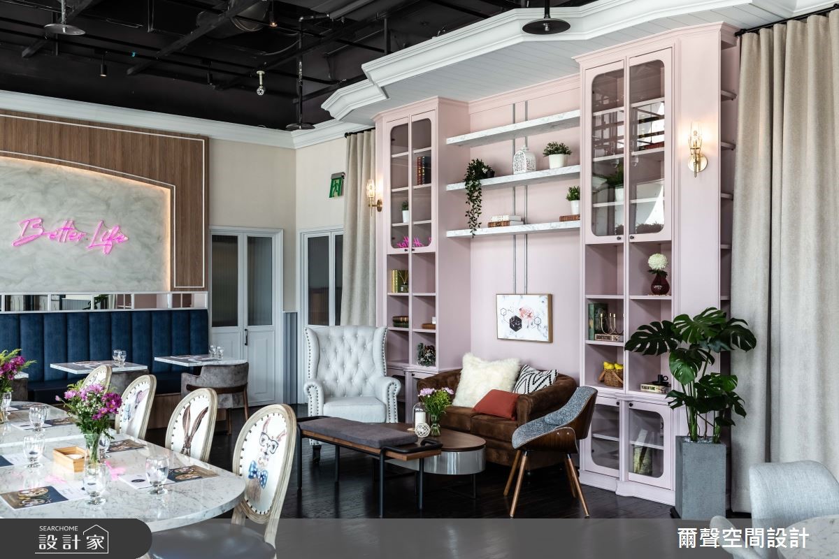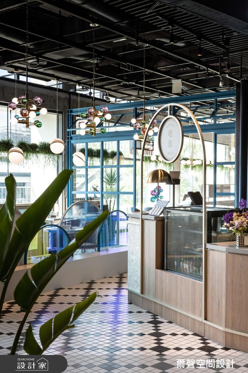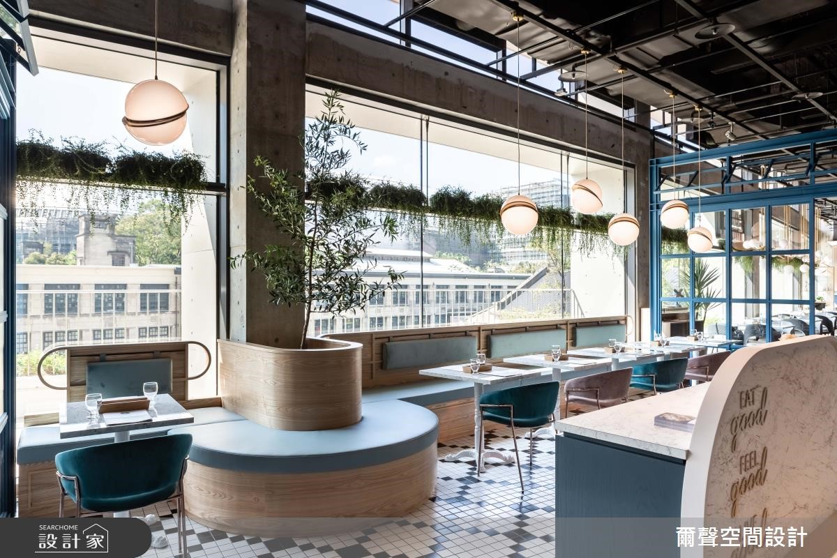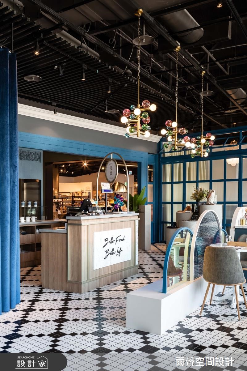 透過弧形落地窗,援引日光入室,輔以垂吊綠色植栽,開拓自然無壓的清新氣息。格局擘劃上,利用品牌的核心價值:「好感、好食、好生活」,以藍色格窗建立三大區域。販售質感選品的好生活區,考量女性客群,以淺藍色和馬卡龍系為底,搭配多彩繽紛的球型吊燈,創造浪漫輕奢的樣貌;好食區,刻意以錯落的奶油色燈飾拉低空間尺度,營造安定溫暖的用餐時光;好感區,則聚焦於霓虹燈強調的品牌精神,並以圓弧外框象徵「家」的意涵,實踐裡外合一的設計理念。