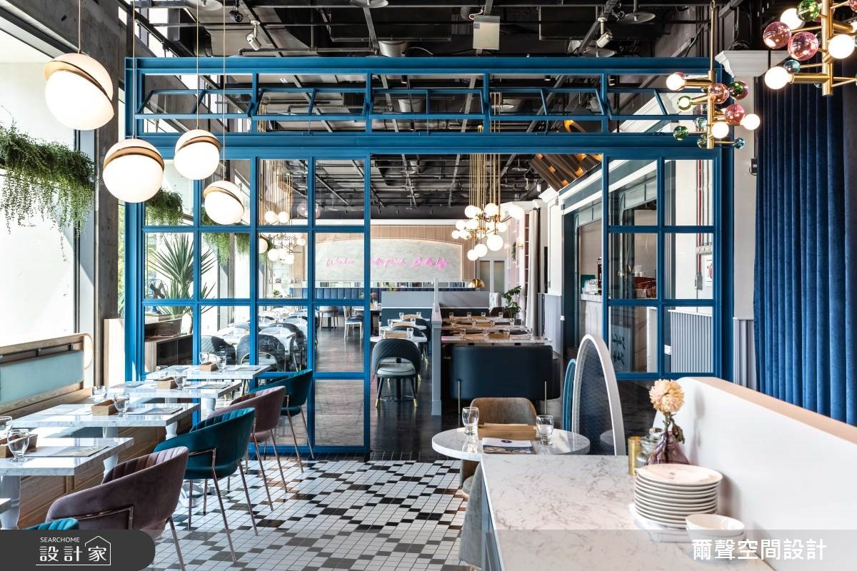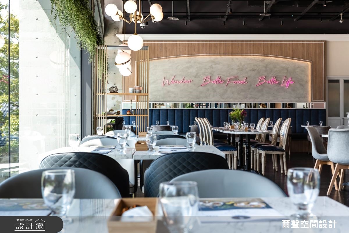 Home Data80坪的「溫叨」複合餐酒館,透過台語「我家」的諧音意涵,道出台式特有的人情味,也希望創造賓至如歸的感受。設計師以普魯士藍跳色,運用深淺色調打造豐富層次,並透過霓虹招牌、台式窗花妝點,強調台菜西吃、東西並存的多元面貌。