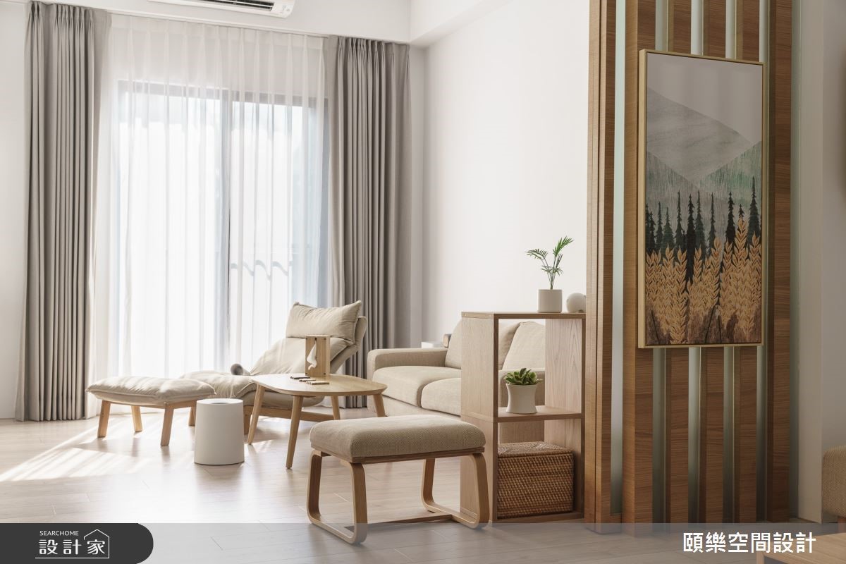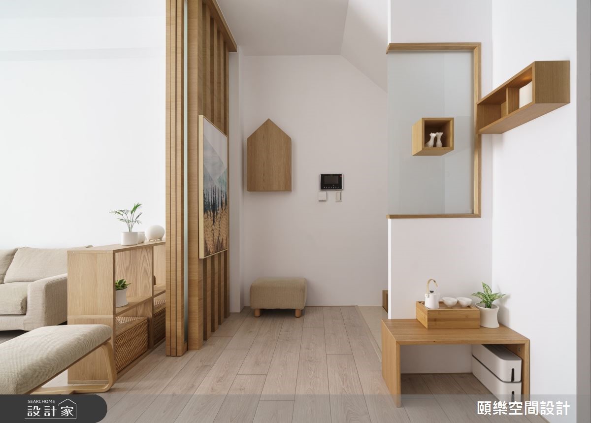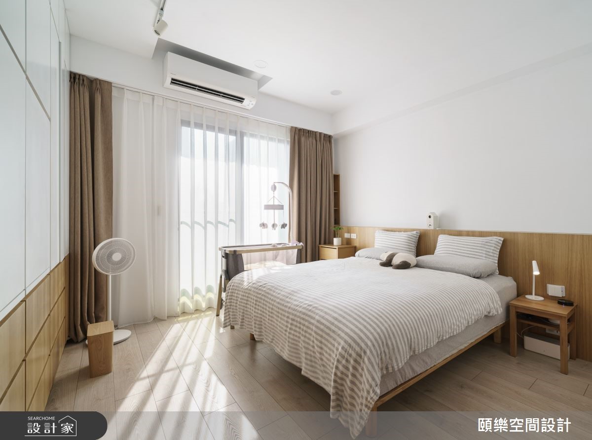 二樓的公共空間,開放式的客餐廳設計,延用原有大型家具如沙發、休閒椅與邊桌,並量身打造木製櫃滿足室內收納。而為了阻隔廚房油煙及避免冷氣溢散,則以連動式的木框滑門作為彈性隔間,霧面玻璃令日光得以灑落全室,即使料理關閉時也能享有充沛的日光,而完善的小米智慧家電系統,只用聲控就能啟動氛圍燈光、音樂與各式家電,十分方便,白色簡約設計更與無印風完美融合。三樓的主臥室,以純白及木質打造整面收納,2:1的比例拋開頂天櫃體的沈重感,並讓空間更顯放大有層次。