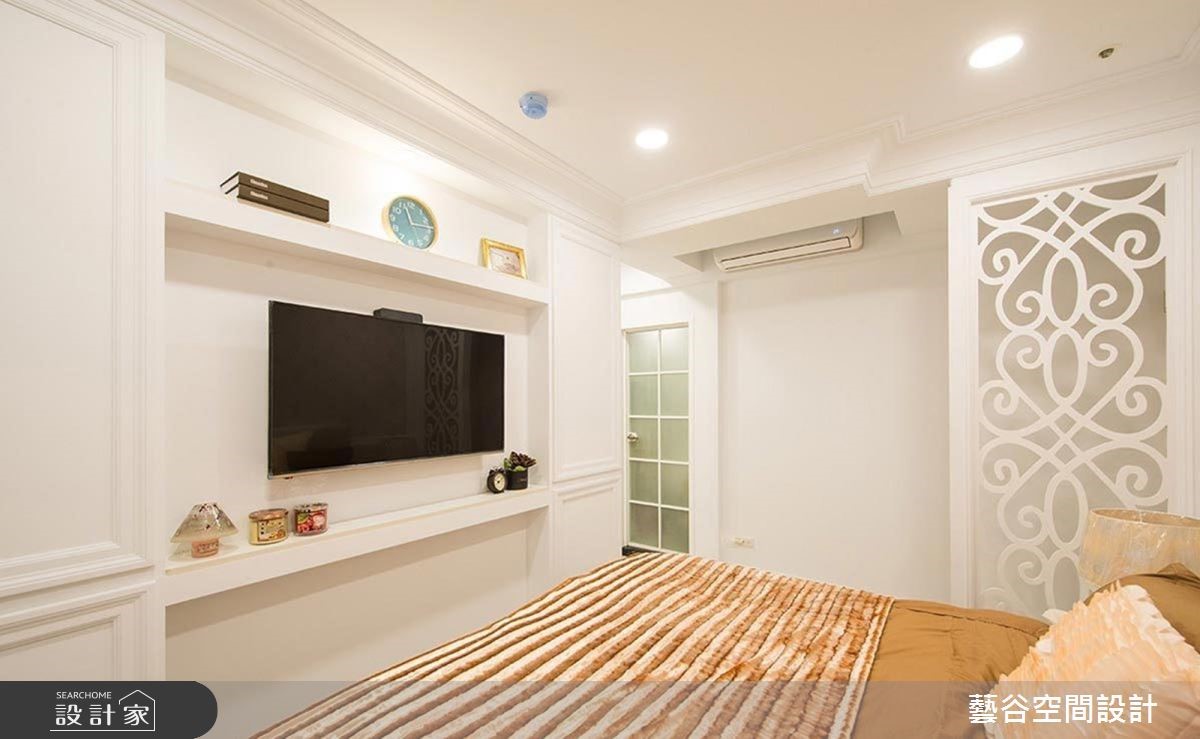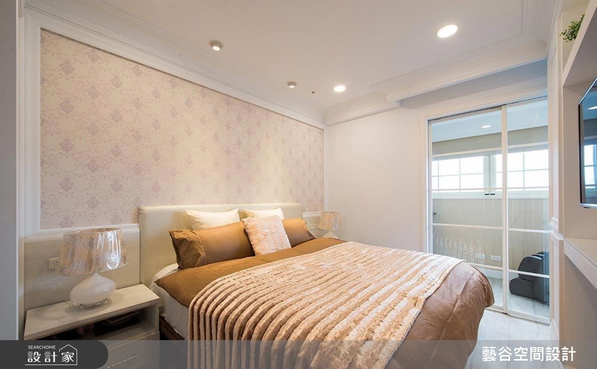 純白色系的臥室內,輔以淡橘壁紙和黃色寢具,在一片純淨下,為室內展現活潑輕快的調性。