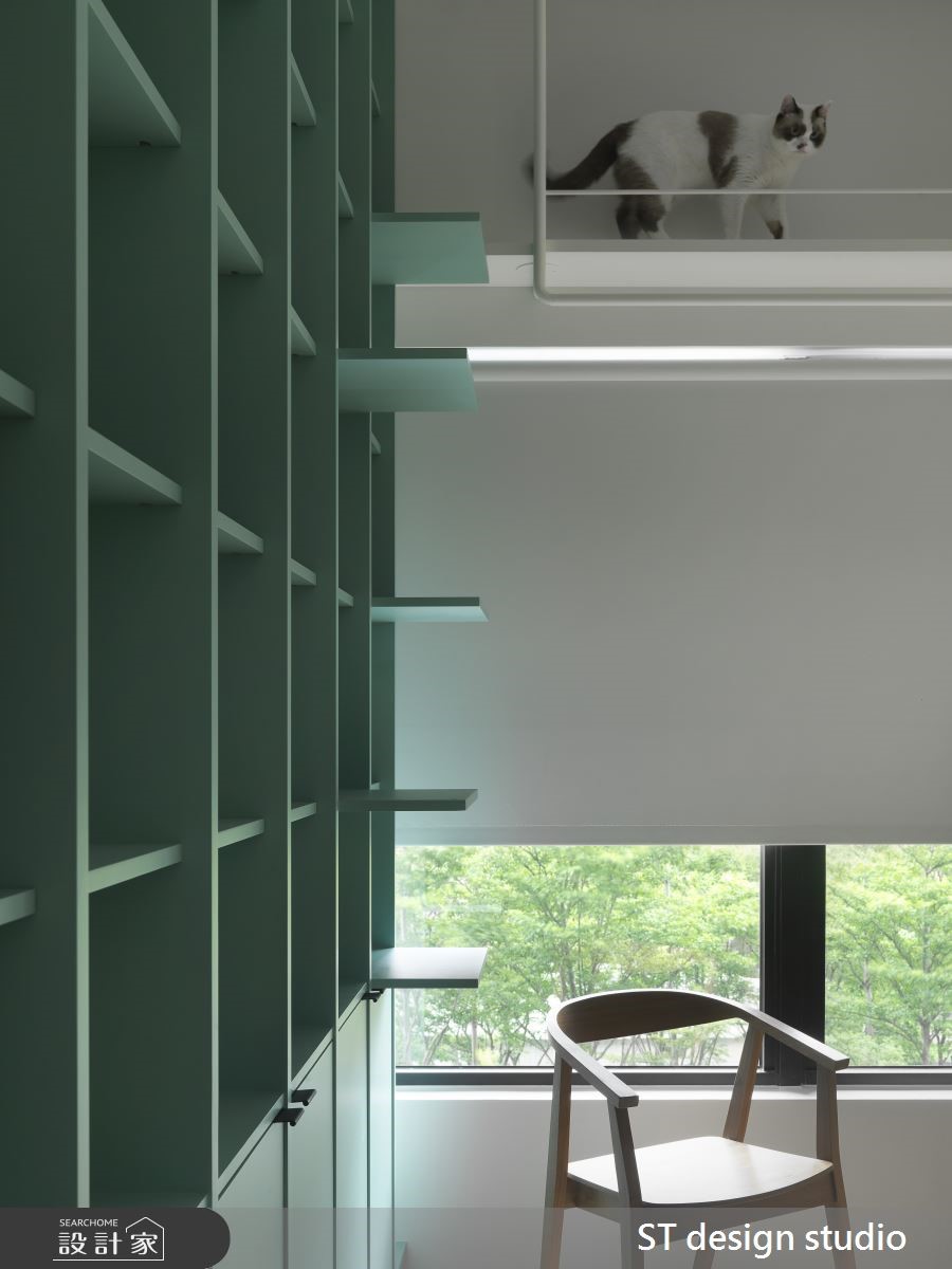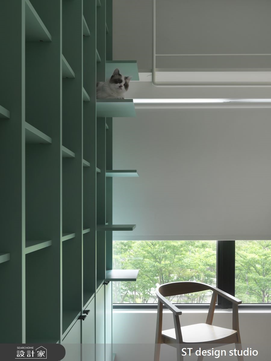 透亮舒適且吸睛的空間中,除了亮眼精彩的收納規劃,對於寵物生活空間也大有巧思。窗邊地帶透過白色鐵件與層板結合設計創造出貓道,把採光最好的地帶留給了貓咪們,下方以吊掛式植栽佈置方式,框出屬於這個家的專屬窗景;仔細觀察薄荷綠大書櫃,上方幾處錯落突出的層板設計,變身趣味跳台空間,瞬間成為貓咪們的遊戲樂園。