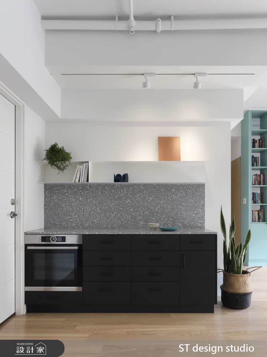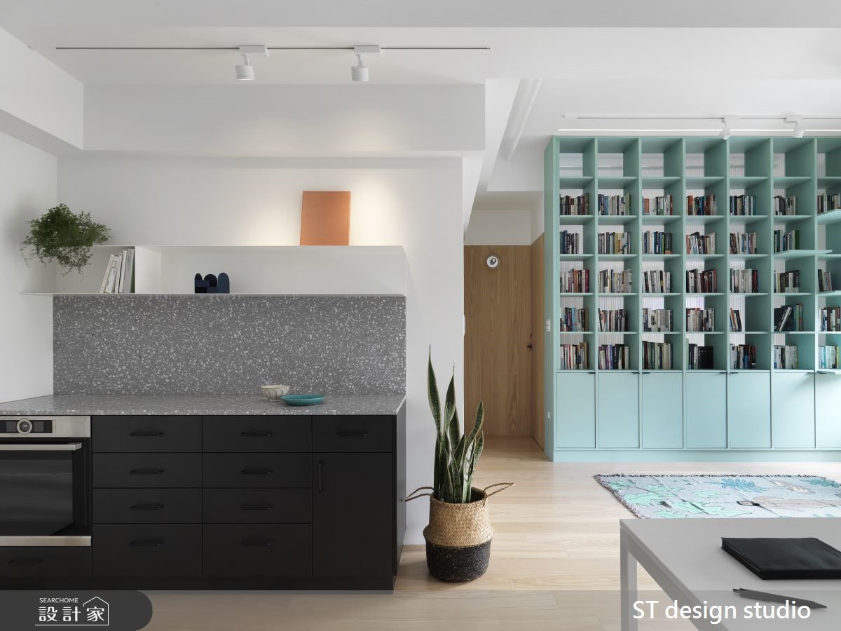 教授屋主們的日常活動以研究及閱讀為主,因此小坪數住宅中屏除傳統用餐區的規劃,取而代之的是實用的多功能大書桌。雖然屋主沒有收看電視需求,但工作上需拍攝紀錄片,因此以投影設備提供觀賞需求。而書桌後方整面純白色系統層架收納,給予大量藏書、生活用品擺置空間;可活動的層板規劃,不僅成為三隻毛小孩的遊樂場所,同時能讓屋主的生活更加便利,如靠近入門處一側即規劃簡易的衣帽掛置處,保留收納彈性。臥室與公領域之間,以格狀薄荷綠置頂書櫃作為隔間牆,櫃體架構為木框架,背牆材質卻巧思選用通透玻璃,保持了兩面空間的透光效果,光線穿透、保有隱私,實現以書作為隔間的浪漫設計。角落處的小吧台,巧妙補充廚房收納的不足且成為放置出入門物品的收納角落,並以對比的黑色系收納櫃、水磨石背板細節,帶來低調高質感層次。