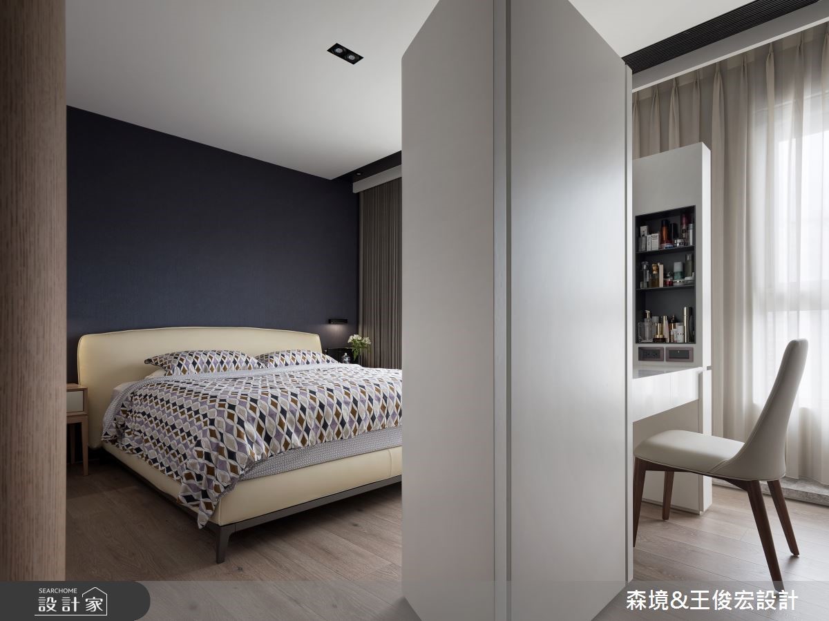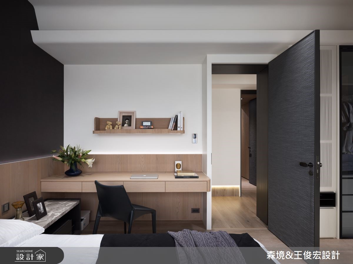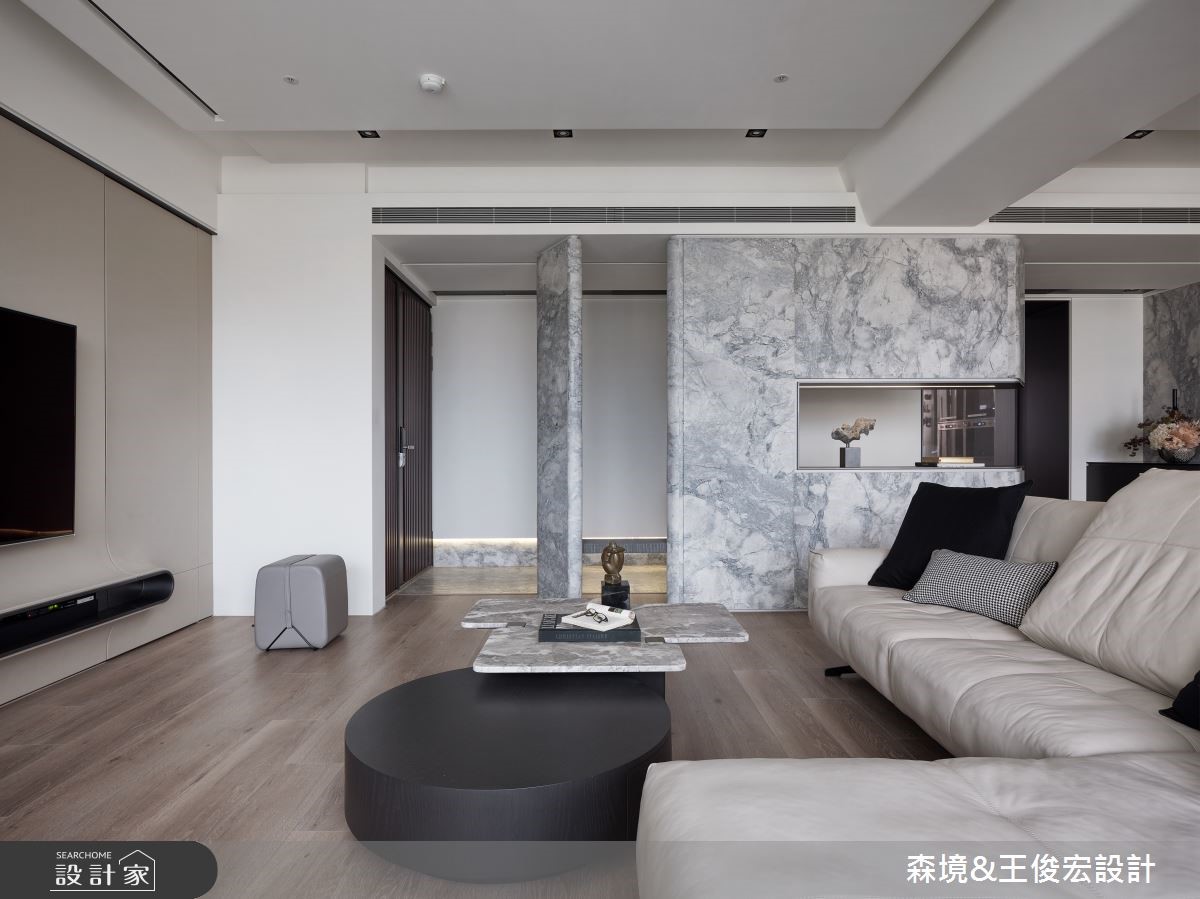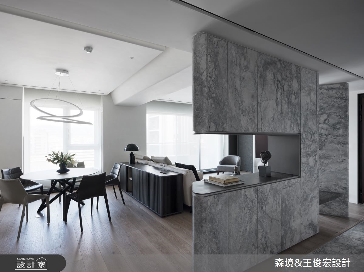 從大門入內,玄關及公共場域以一道厚實的隔間量體區隔,其刻意導圓的轉角象徵人生歷練的圓融,也顧慮到使用的安全,並巧妙化解風水穿堂煞氣。客餐廳採用開放式設計令視覺感受放大、寬廣,並利用傢俱為場域作界定,讓動線、光線暢行無阻。而客廳電視牆運用皮革包覆,其細膩的圓弧轉角呼應玄關隔屛,其後方隱藏大量的儲物空間則滿足家中的收納需求。回應屋主的生活習慣,設計師將原本的三房改為雙主臥格局,讓使用空間更擴大,臥房及梳妝台之間則延伸公共區域的圓弧線條,也是關照居家生活的安全性。