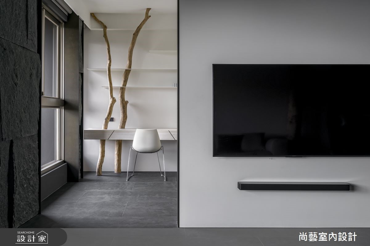 從大門玄關入內,地坪利用高低差設計落塵區,巧妙界定場域,開放式的客餐廳位於同一軸線上,使空間感延伸。客廳落地窗兩側天然石皮、沙發旁的樟木樹幹、地坪的深色板岩磚、天然裂縫的茶几等,充滿大自然的生命力,令人仿若置身叢林之中。而電視牆左右兩側分別通往入口衣帽間與書房,透過薄鐵件的修飾,達到平衡美感,書房亦延伸公共空間的樹幹概念作為層架結構,讓內外有所呼應。而轉進廚房空間,高低檯面的中島吧台既方便使用也好整理,由餐廳延伸至吧台的木質門片則完整空間主題。