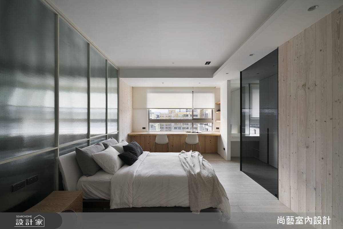 主臥空間內透過床頭的小冰柱玻璃、樹木圖像與木質營造出步入大自然中,芬多精繚繞身邊的感受,也給予寧靜且舒適的睡眠空間。