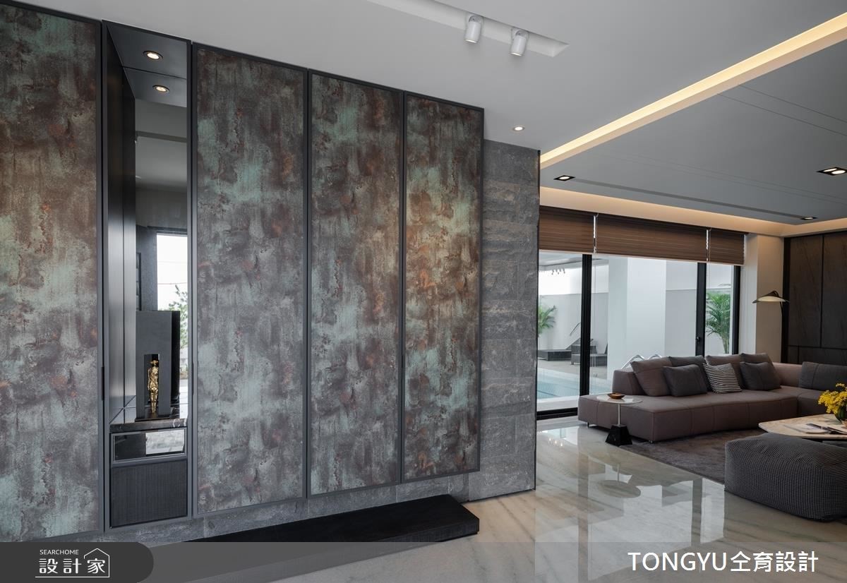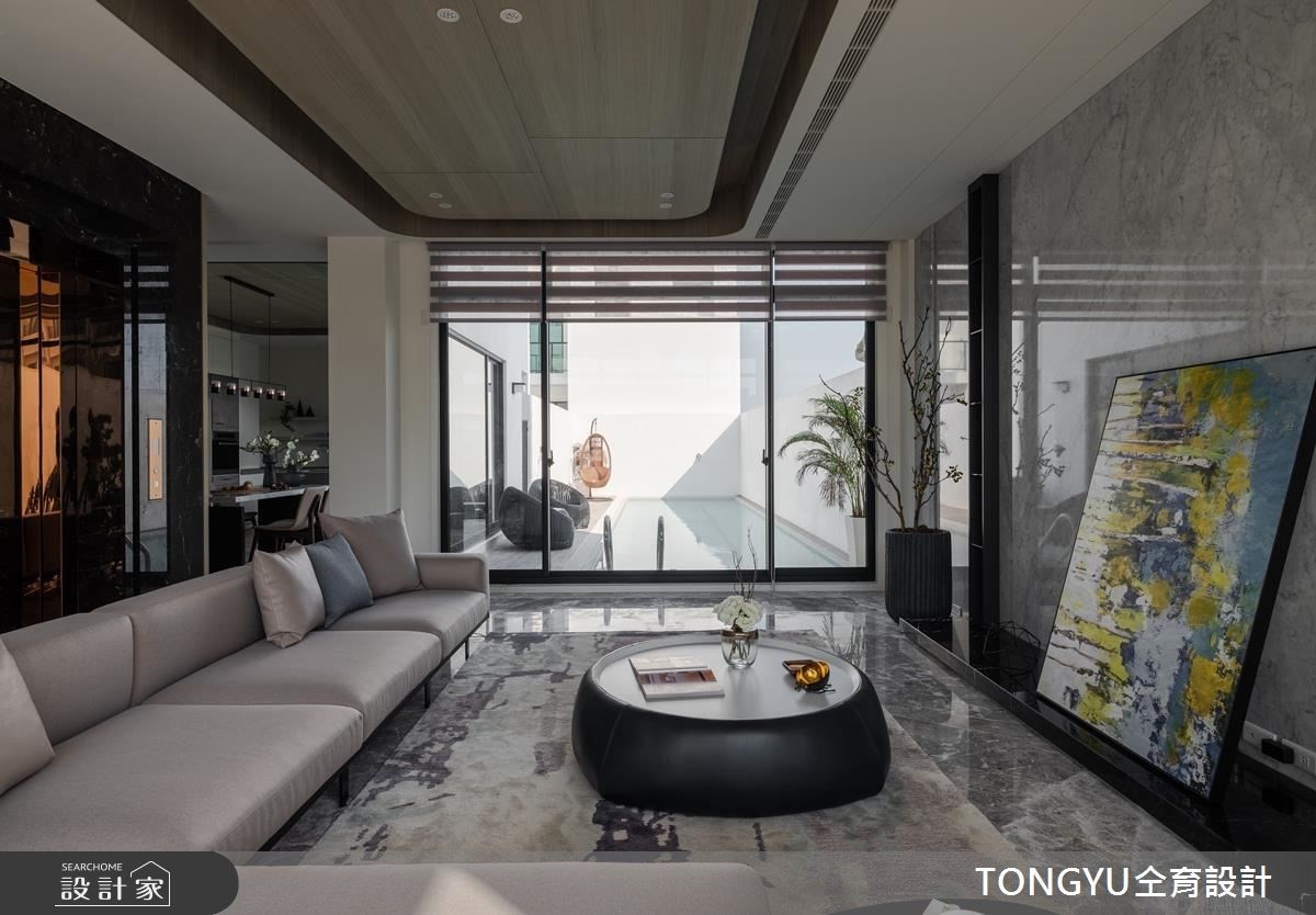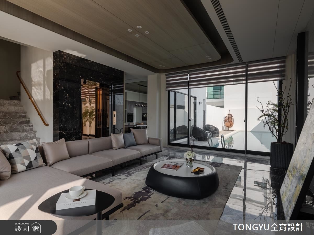 一樓公共空間順應 L 型的基地條件,規劃開放式的客餐廳,低檯度的沙發、茶几,搭配大面積的落地窗,讓人無論身在何處,都能恣意欣賞戶外泳池、魚池景觀,不用出遠門就能享受愜意的渡假氛圍。建材選擇方面,也透過天然大理石、天然水染鋼刷鐵刀木皮、鐵件、白橡木鋼刷板等,展現剛柔並濟的自然意境,令人回到家立刻釋放緊繃的心緒。