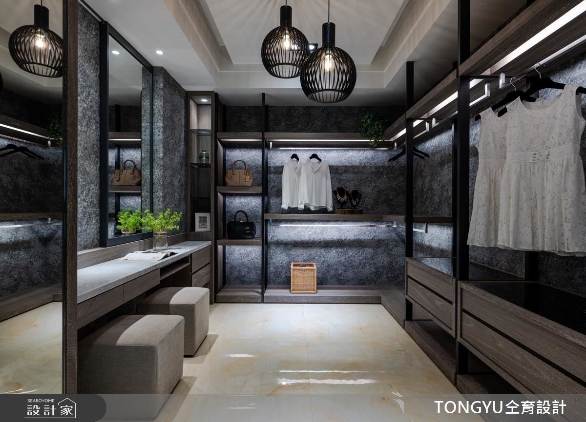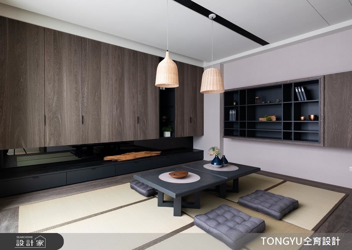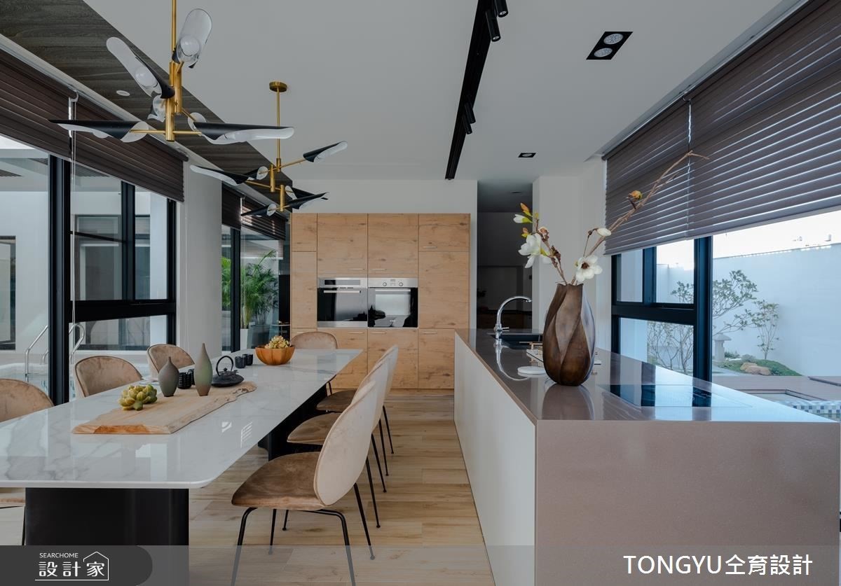 餐廚區以平行形式安排長餐桌和中島吧檯,使動線更為流暢,同時能飽覽戶外景緻,營造親友談心的最佳情境。品茗區藉由中央方中帶圓的茶几,傳遞淡淡茶香縈繞的禪意,而造型吊燈及深木色櫃體則表達脫俗的沉穩質感。私領域考量未來三代同堂的居住可能,細膩規劃雙主臥和三間獨立臥房,讓孩子、長輩都能獲得良好的生活品質。