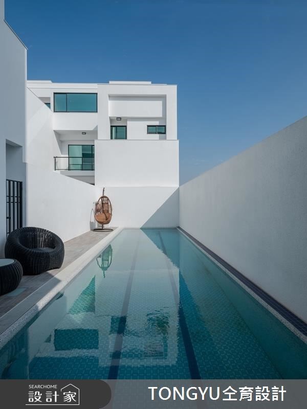 設計師為屋主量身打造歐美電影常見的私人泳池,岸邊擺放躺椅與吊椅當作休憩使用,望著藍色池水反射透天厝的白淨氣場,心中也自然平靜下來。
