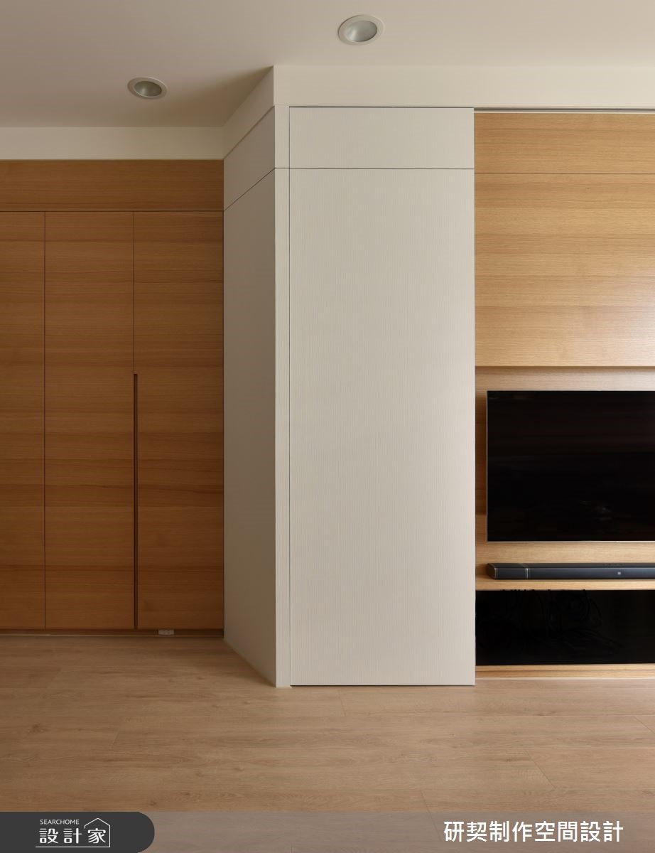 格局擘劃上,將傳統的三房兩廳格局進行微調,確立出公、私領域,讓一字型的公領域藉窗外引入充沛日光,並描繪出流暢的居家動線。玄關區域,運用暖灰色地坪界定落塵區,循著超耐磨木地板踏入室內,透過隱藏式設計,將儲藏室暗藏於電視牆後方,並以純白、木色系統櫃結合兩側牆面,運用精簡、俐落的手法,賦予屋主充沛的收納需求,更維繫自然清爽的空間樣貌。餐廳場域,讓電器櫃和牆面合而為一,在大篇幅留白中,以線條簡約的金屬燈飾,和木質餐桌椅,形塑一幅清新獨特的居家端景。