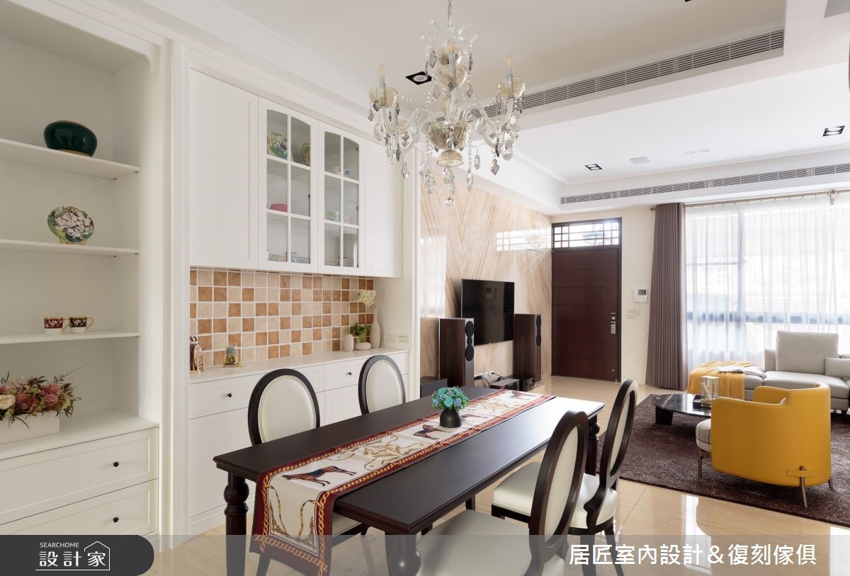 公領域以米色與白色作為空間主視覺,沙發背牆、餐具櫃的少量線板襯托出優雅的美式氣質,並將視線主要聚焦在暖色大理石電視牆,傳遞客廳的溫馨感受,自然而然拉近家人距離。水晶吊燈定義出用餐環境的高雅氛圍,而餐具櫃牆面鋪排了美式不修邊磁磚,呼應屋主夢寐以求的居家質感。