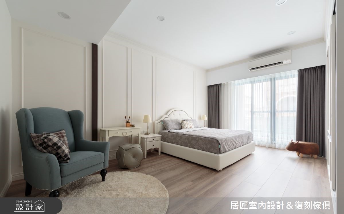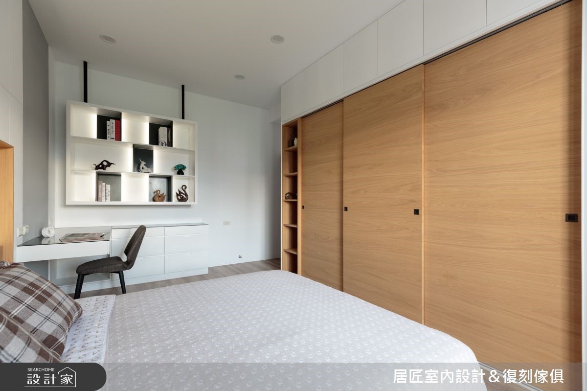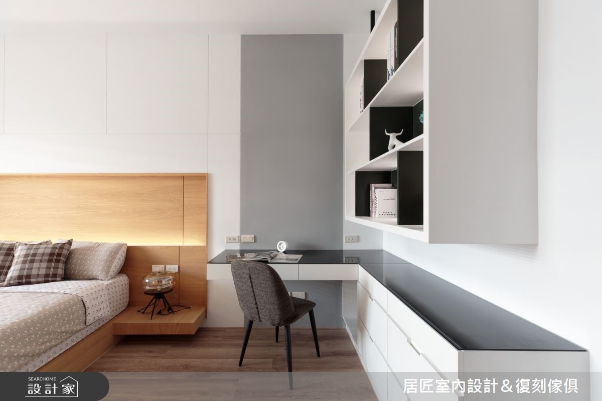 主臥延續公領域的線板元素,搭配米白色系的床架、梳妝檯、床頭櫃,在超耐磨木地板的映襯下,舒適又不失份量感。另外,設計師針對兒子們的喜好,創造出兩間小孩房的亮點,像是哥哥的嗜好為攝影,因此特別設計了嵌有光源的作品展示櫃;弟弟的房間則以樂高造型的書櫃,加上衣櫃的藍點點把手,跳脫出俏皮感。