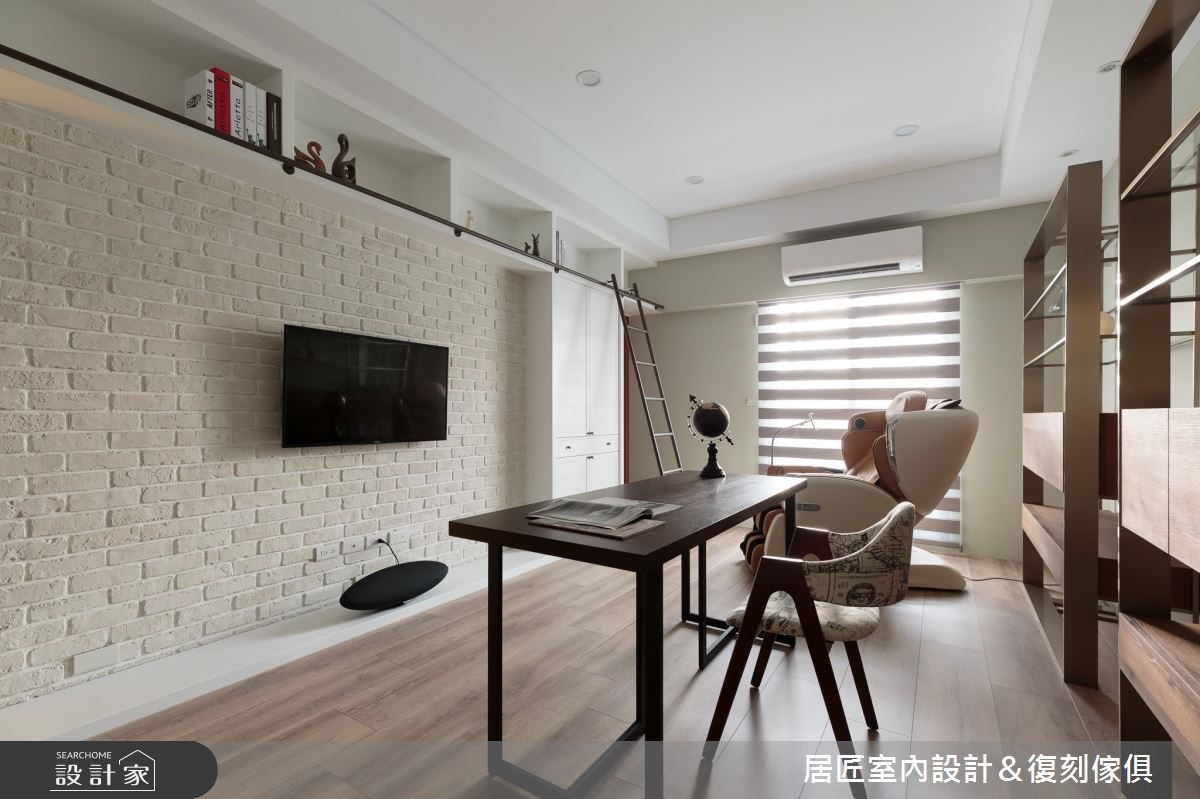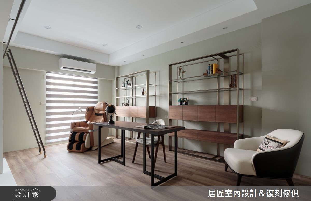 書房運用莫蘭迪綠將家人緊緊擁入懷中,輕盈的櫃體設計減少壓迫感,且貼心地附上梯子方便拿取書籍,讓爸媽可以在此辦公或坐在按摩椅休憩,孩子能夠陪伴在側聊天閱讀,一家人共享天倫之樂。