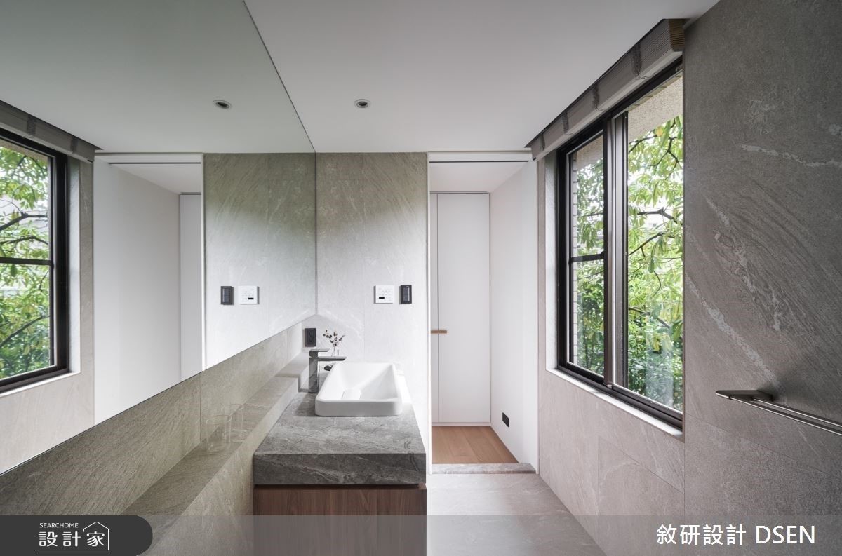 材質是塑造空間氛圍的關鍵元素之一,無論於立面或者地面,都能藉由材質的觸感增加空間表情的豐富度,除此之外也應根據使用需求靈活的調整。基於屋主對於烹調的喜愛,敘研設計於公區域的地面採用異材質拼接設計,客廳以白橡木鋪設地板,銜接廚房區域的磁磚地面,由於木地板的紋路較深,表面凹凸較為明顯,為了避免在烹調時不慎滴油或者汁液到木地板上,進而卡在紋路中,日積月累造成吃色,故而做此設計,方便屋主清理與維護。廚房地面的磁磚刻意選用 60 x 120 公分的尺寸,減少切割面以及接縫線條,使其具有石材地面的質感,也在無形中提升了空間的整體氣質。浴廁設計亦花了許多時間與屋主討論,由於屋主希望廁所內的櫃體能捨去制式的層板,因此敘研設計利用牆壁的進出面落差,創造可收納的空間,輔以間接光照明,跳脫制式化的掛櫃設計,使空間更加俐落且具現代感。