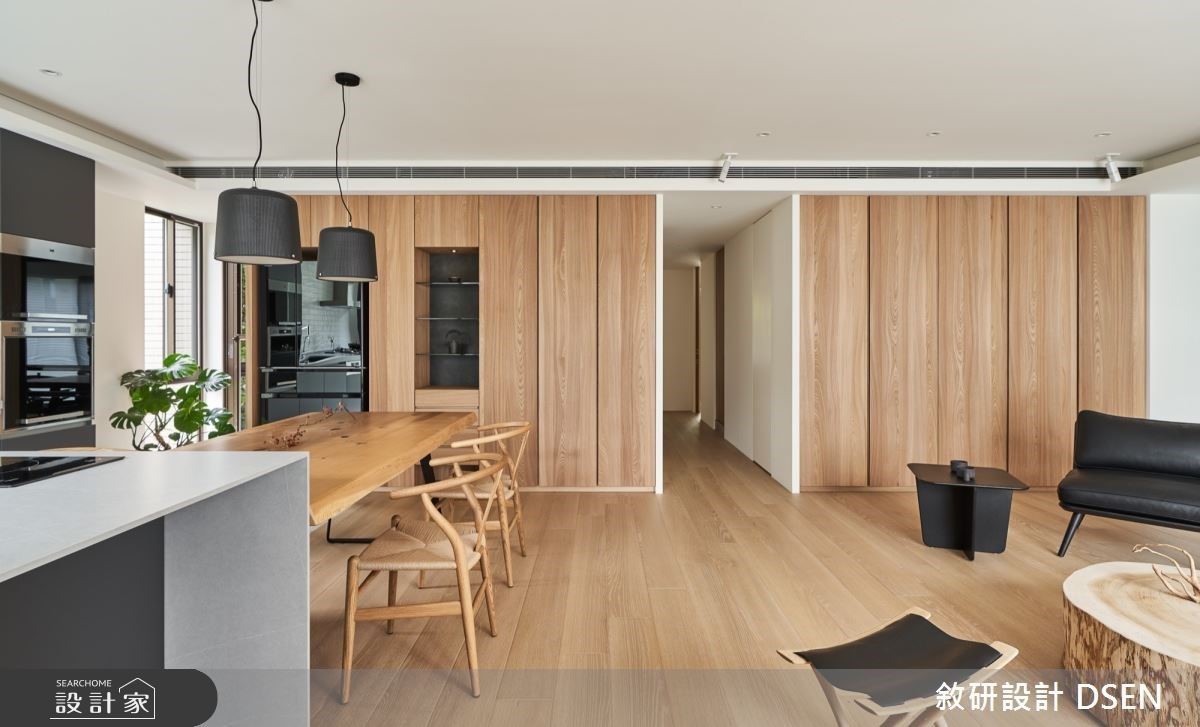 於色調純粹質樸的空間中,置入具有現代設計風格的家具燈飾,並且將室內收納櫃體以無框式設計表現,刻意省略門框的設計,讓視線延伸無阻,空間的視覺感顯得更加簡潔俐落。盈滿全室的白橡木紋理輔以流暢乾淨的線條感,呈現溫潤中含有內斂時尚的風格。