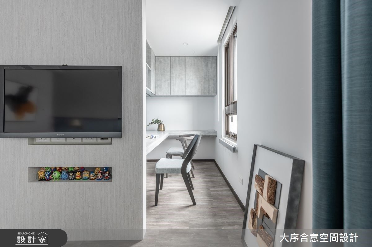 主臥床頭背牆選搭金色華麗感繃布,襯托屋主低調內斂氣質。兩側更結合透光石光帶,在光線映照下,以石材紋理凸顯屋主尊貴品味。更衣間規劃上,設計師考量屋主原有家具,精心挑選相近配色,呼應整體質樸調性,打造舒適無壓氛圍。設計師更以職人匠心打造大男孩房的繃布床頭背牆,讓休憩之中處處感受生活細節的精巧之處。小兒子房則為了主人心愛公仔收藏,規劃一面專屬展示櫃,更創意運用牆面角落隱藏主人的祕密收納區,完備臥房的生活機能。