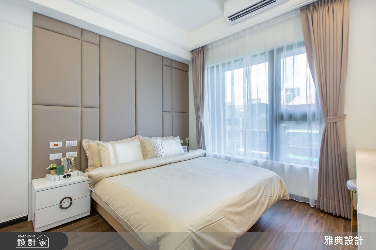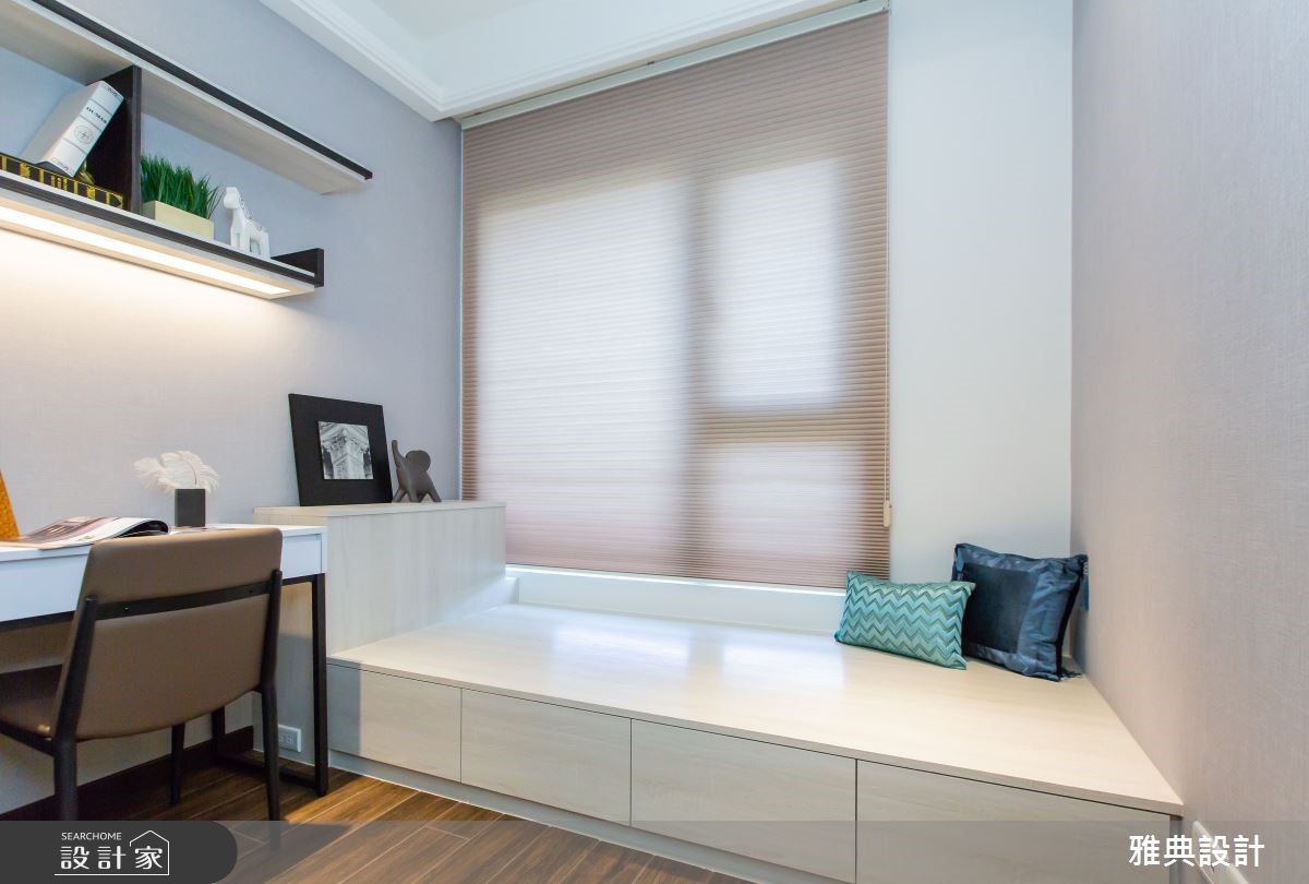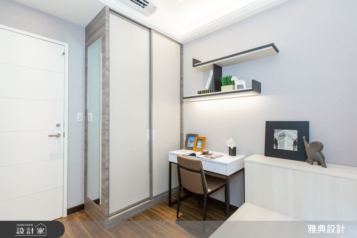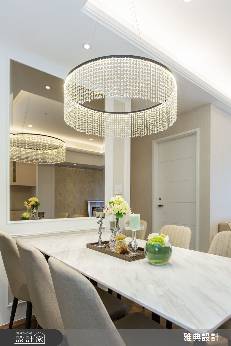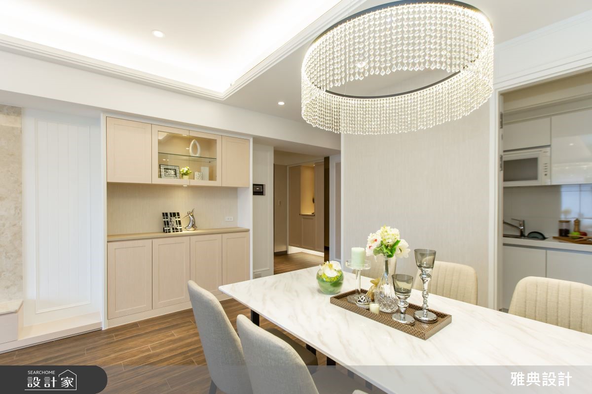 玄關入門處,選擇將懸浮櫃體收整於樑下以修飾樑柱,搭配展示平台結合雙邊對稱的衣帽櫃,以藝術裝飾建構視覺焦點,展現入口段落的趣味性;從玄關到餐廳的L形牆則設置內藏廚房,隔除油煙散溢,但同時與餐廳互動零距離,搭配客餐廳的開放式規劃,讓一家人可隨時交流無礙,並在餐廳牆嵌上鏡面、水晶燈相互輝映,形塑華麗的氛圍;並採以暖色石材建構客廳電視牆,增添微奢的空間氣質,再搭配收納矮櫃,可收放視訊設備和零碎雜物,又兼顧展示功能;書房內規劃了臥榻,可兼具客臥使用,提供閱讀、休憩等功能,衣櫃也安排外掛式的穿衣鏡方便穿衣打扮,書桌則兼作梳妝台,展現多元主題;主臥床頭以繃皮凝聚溫暖質地,並以幾何線條添柱變化的律動,同時給予簡練的留白美學,使整體散發舒眠氣息!