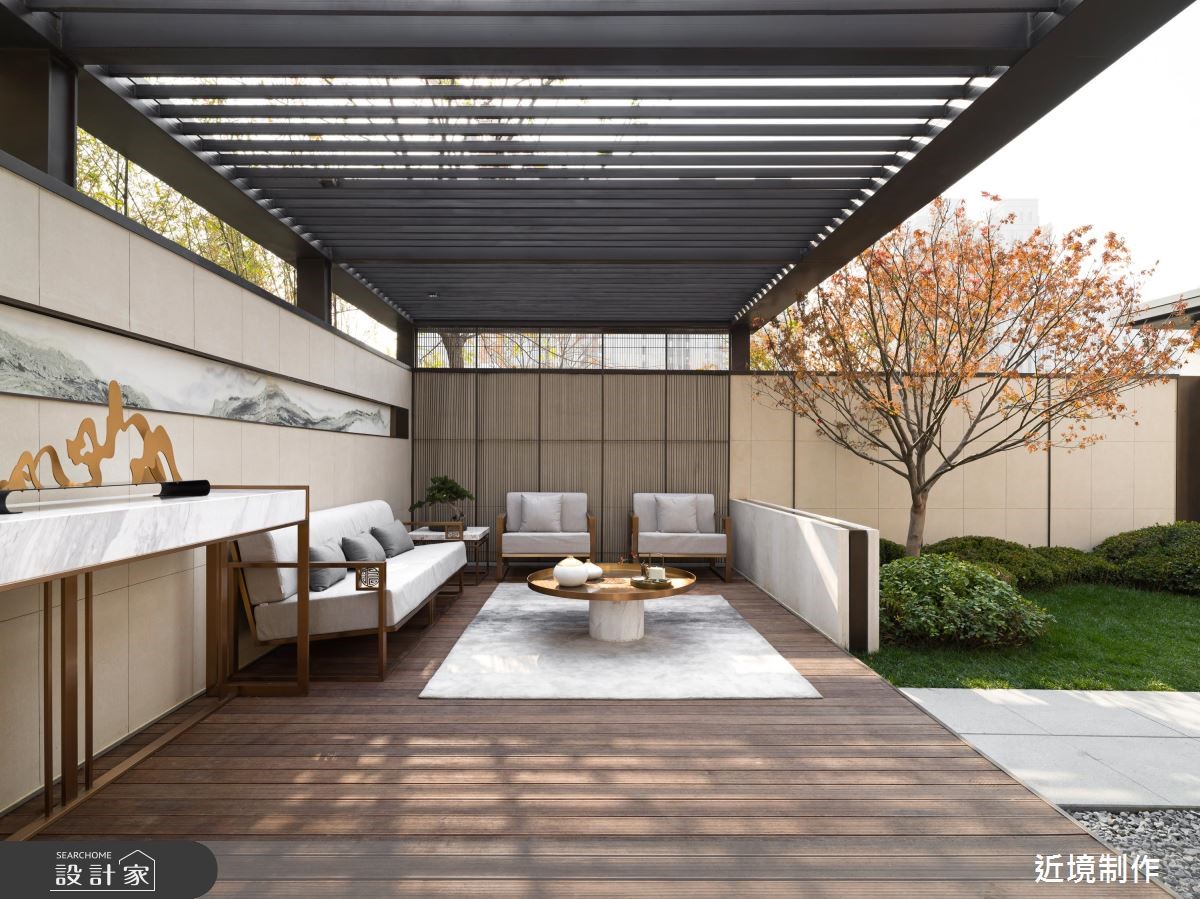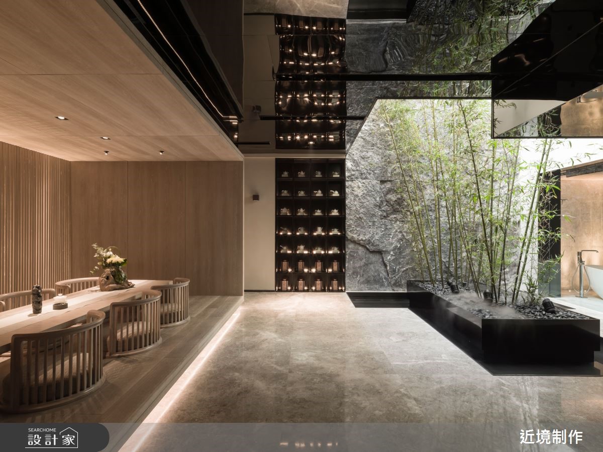 品茗區透過竹林、水景、天光洗滌心靈,並搭配茶磚牆的茶香氣,讓品茶過程中提升視覺、味覺、嗅覺、觸覺、聽覺達成豐富的五感體驗。