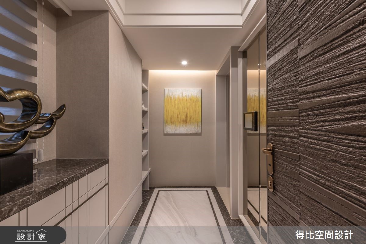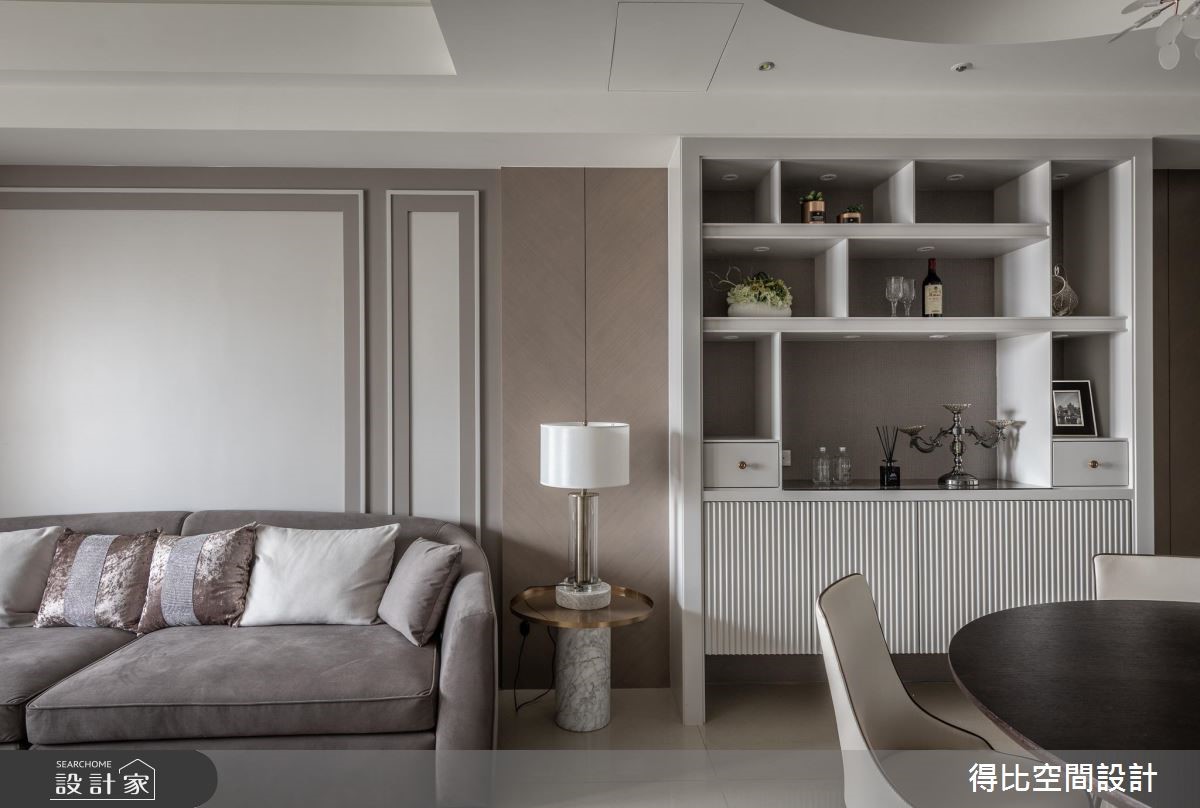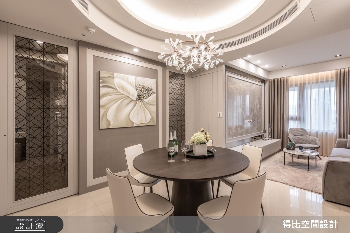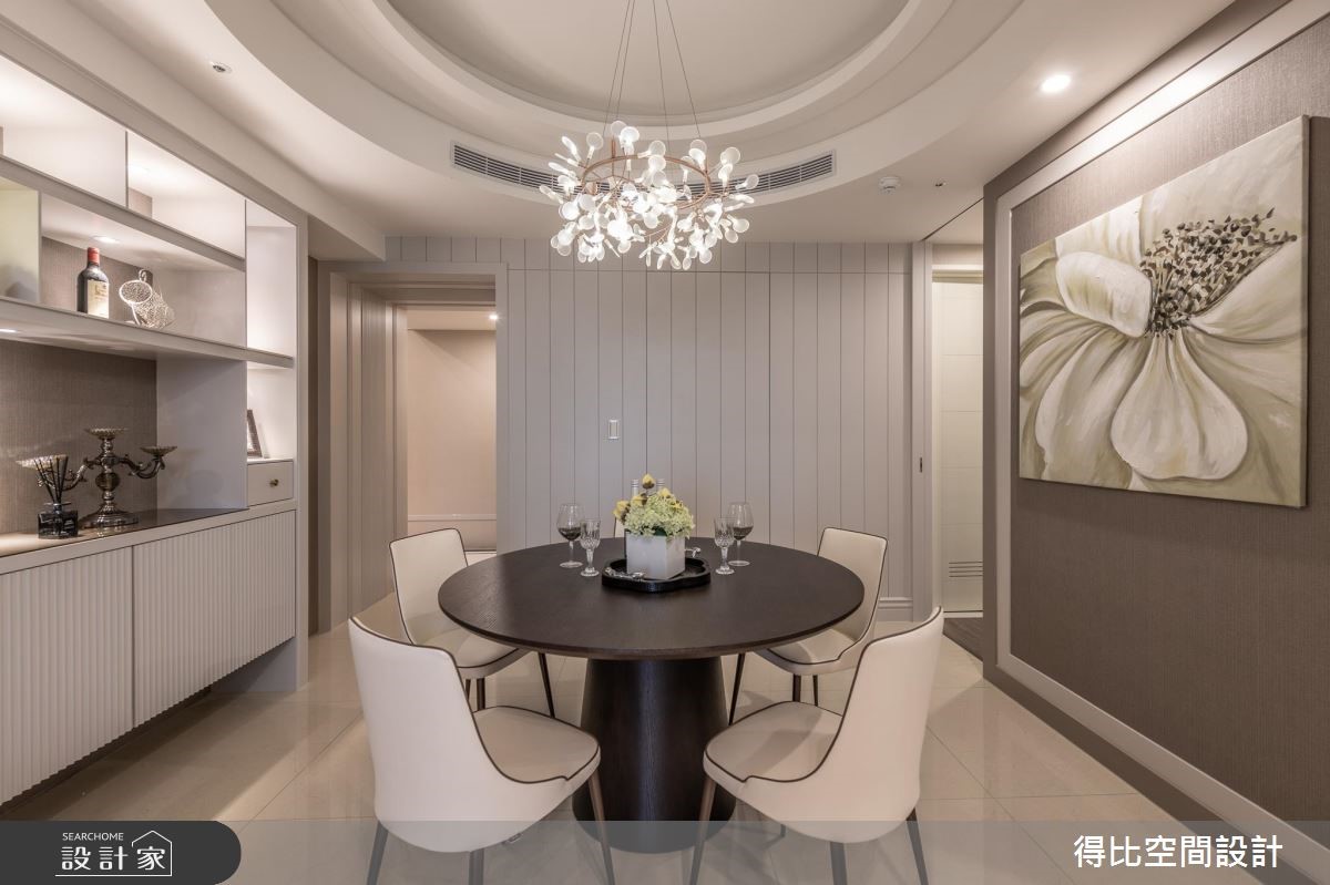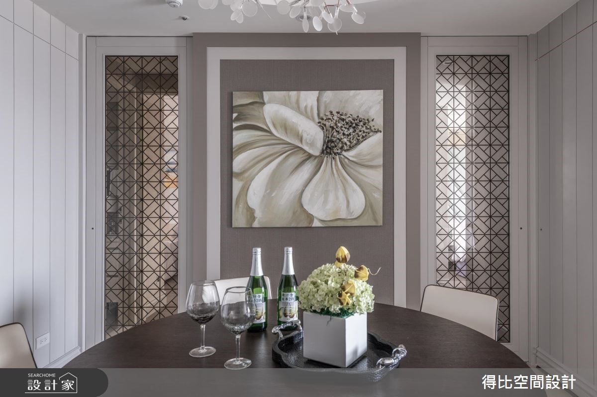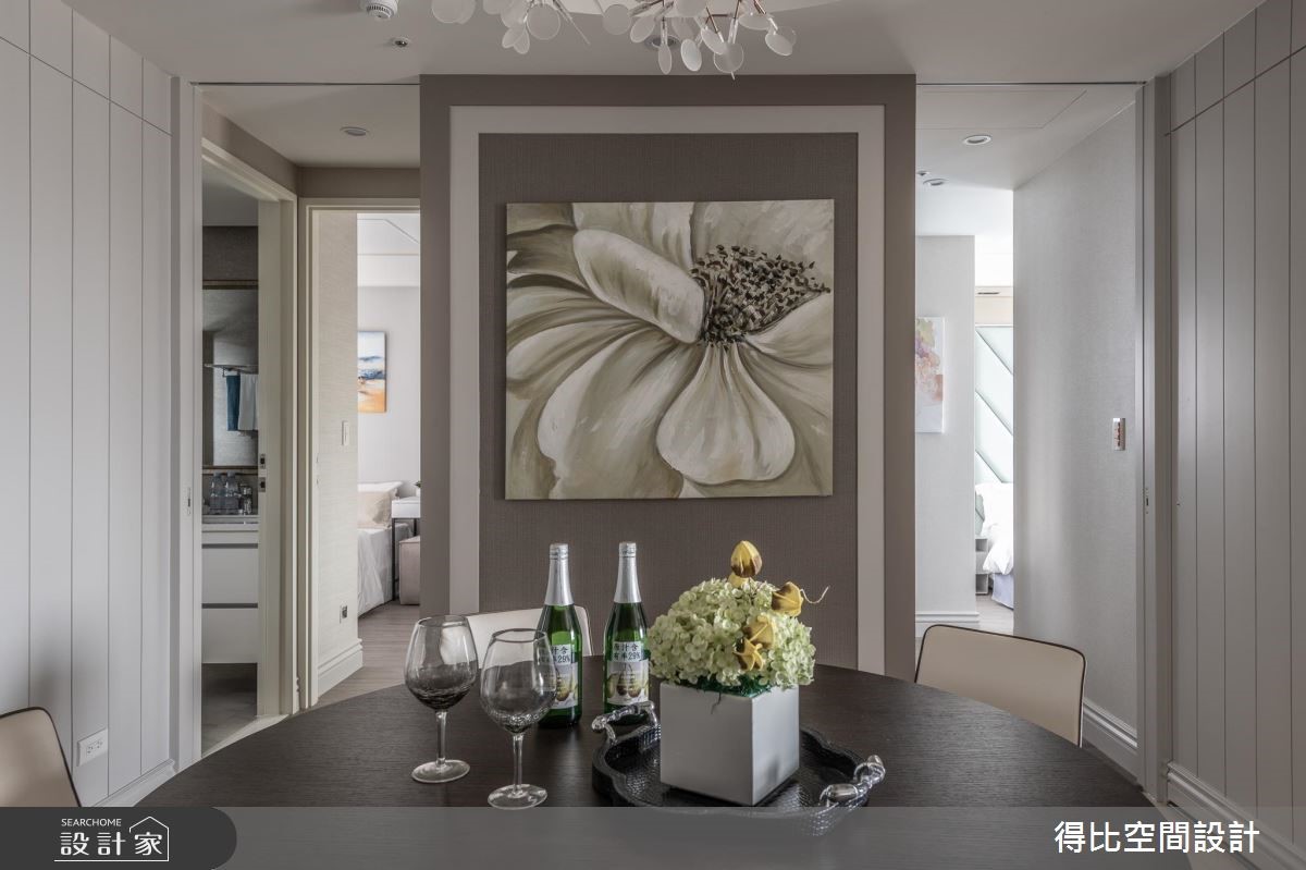 旋開大門踏進玄關,打造充裕的鞋履收納,盡頭壁面以一幅明亮的金黃色油畫擦亮視覺美感,營造絕佳的迎賓氛圍。公領域裡透過大面積的米白色調襯底,間接以藕色系點綴,白天隨著落地窗引入自然光,調和出靜謐、雅緻的氣息;當夜晚將室內燈光打開後,空間裡渲染一股香檳金質感,替和諧的線板造型、古典家具添上動人的雅緻美感。餐廳天花板以漸層弧形勾勒出挑高天際,空間裡因為擺放一幅訂製的花朵藝術畫,演繹新古典的清香靈感,敞開的花瓣彷彿對應白色餐椅的弧形線條,中央細緻的黑灰色調花蕊,呼應細膩美感的餐桌吊燈;餐廳主體牆的兩側則透過黑玻璃格紋拉門,彈性界定出公私領域,關上門扇後可降低噪音的干擾且保有隱私,若全然開啟門扇,整體空間更顯通透、寬敞。