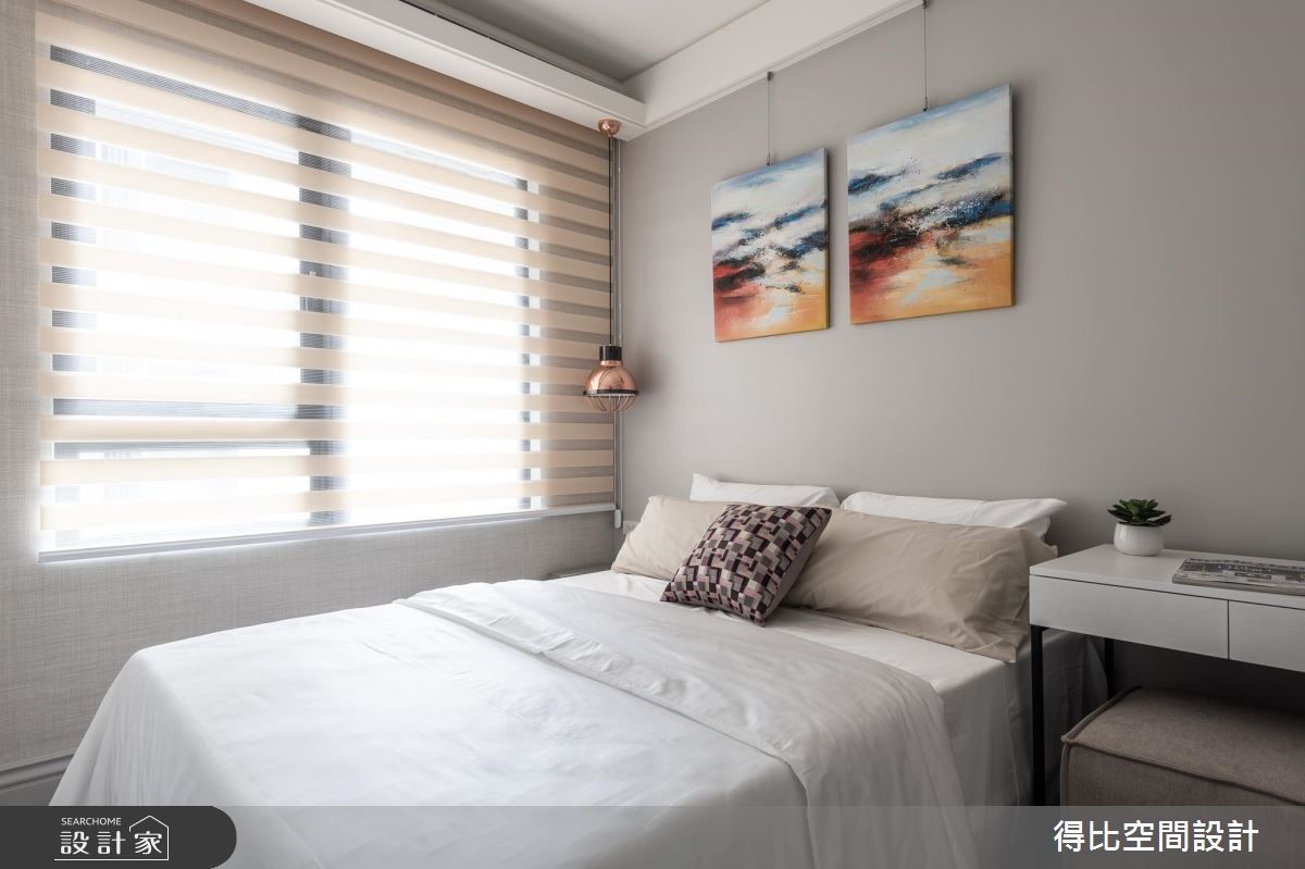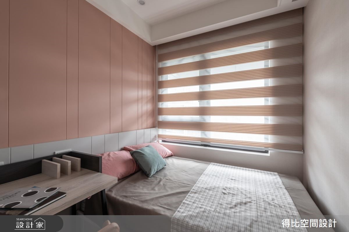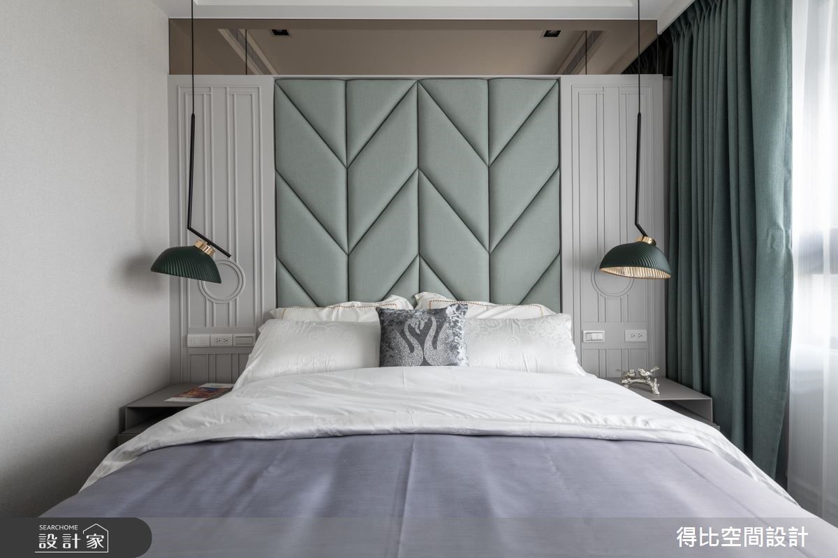 私領域裡利用湖水綠、粉與灰色調的主題色彩,詮釋不同屋主的性格與品味;主臥床頭牆更透過線版、繃布與設計吊燈描繪出漸層美感,局部則鋪陳茶鏡更添溫潤氣息。