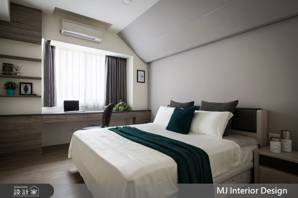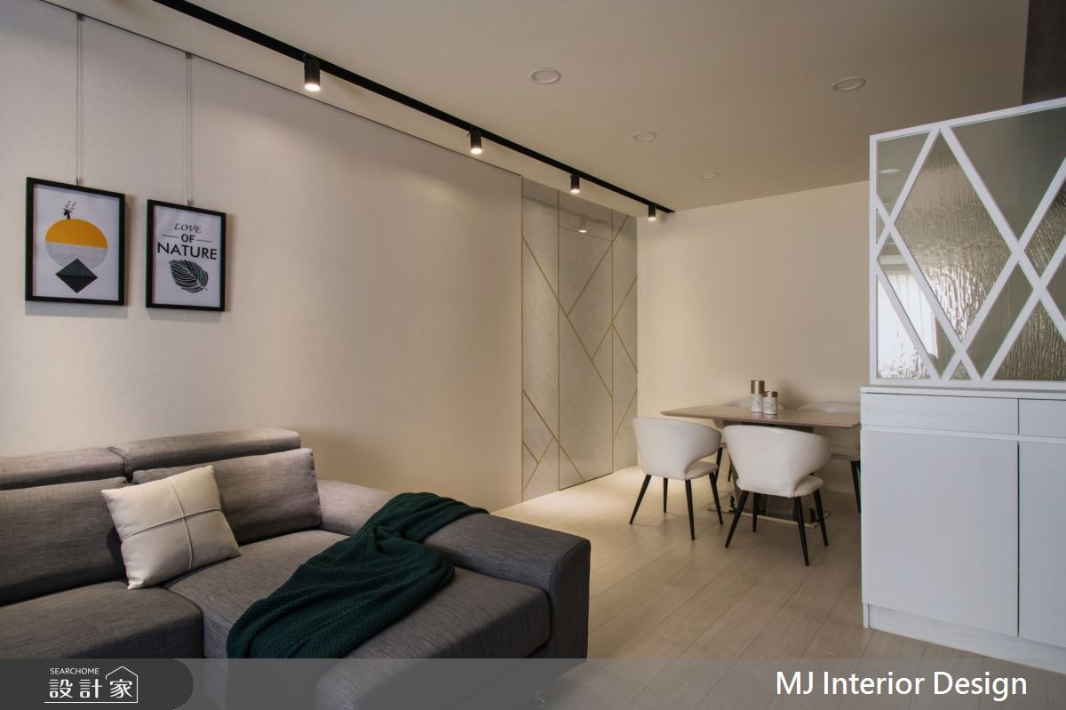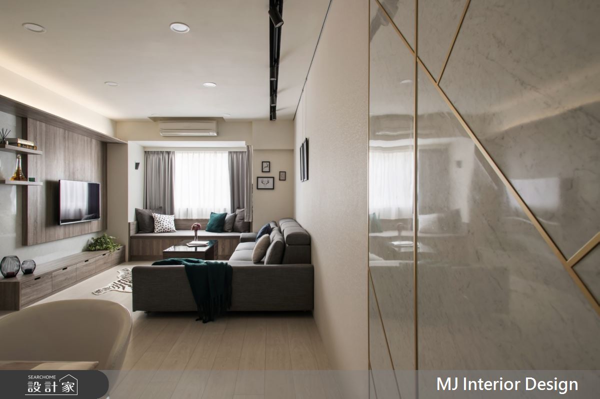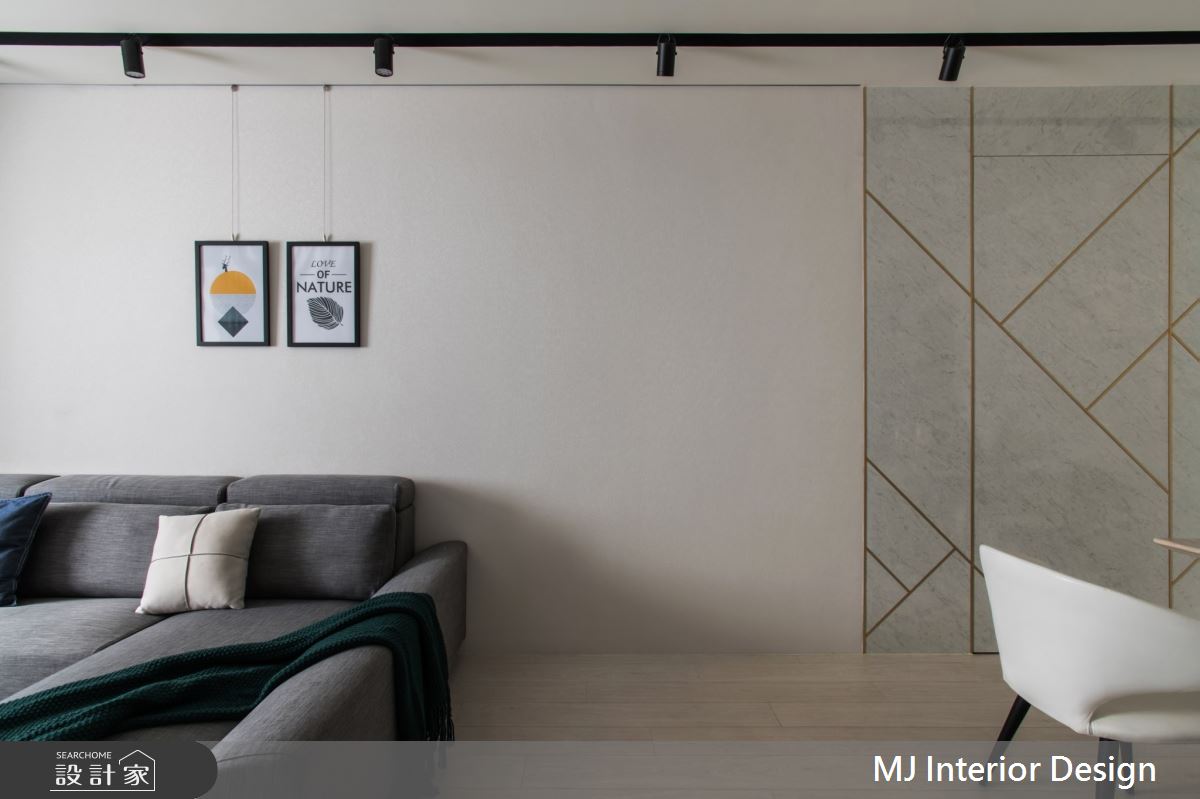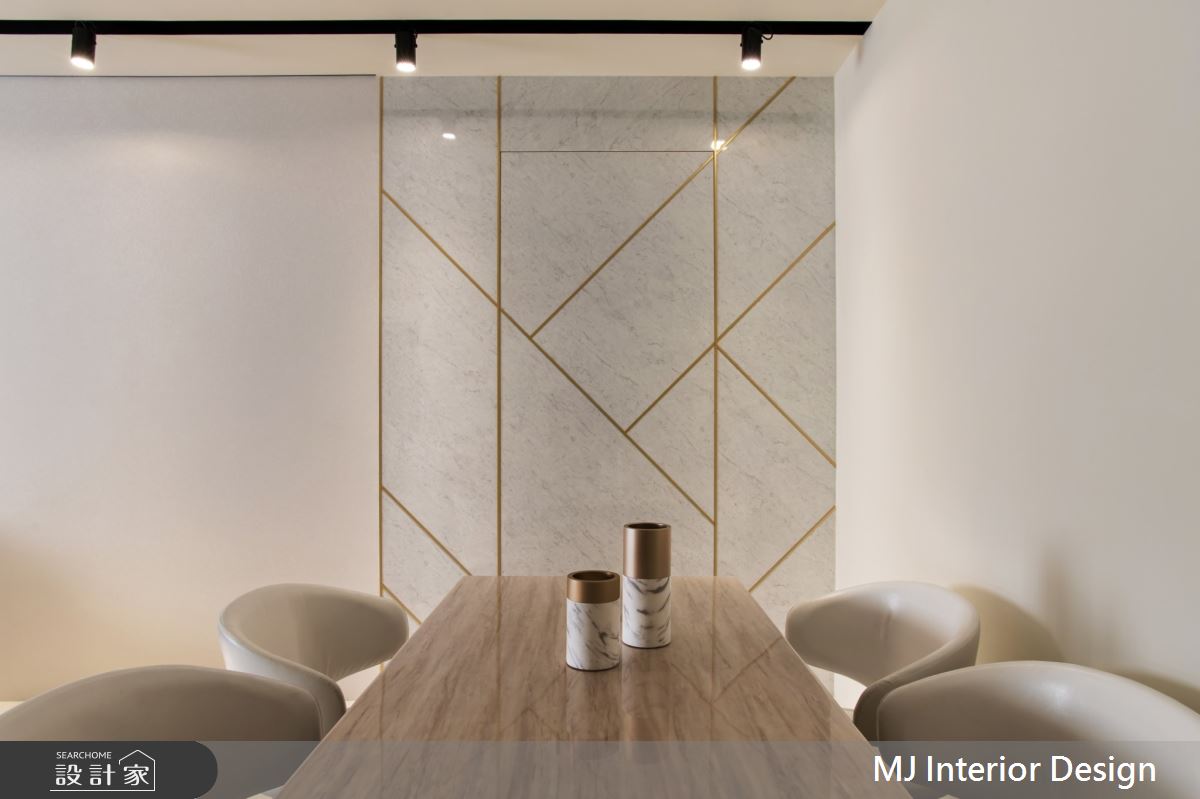 居宅坐擁雙面採光,但考量到客廳屬狹長型,造成餐廳區段光線比較不足,因此在客餐廳增加了間接光源,補足餐廳的光線,而針對老屋的漏水、窗框有水痕的問題,則請外牆抓漏的師傅在外牆上防水漆,室內牆再過防水程序,解決窗框滲水的問題;同時貼近女主人需求,選擇就三個房間的入口收到餐廳旁的隱藏門後,門片部份融合了大理石美耐板、金屬鋁條線條,分割出時尚立面表情;主臥室內,沿著窗面規劃書桌兼化妝台,滿足機能需求,並做出斜天花板造型把樑隱藏收整,搭配細緻的線性燈光,營造如同星級飯店的奢華感!