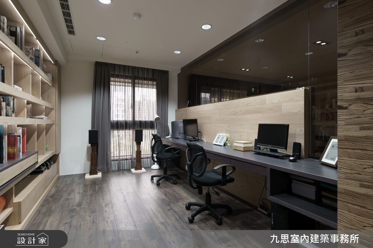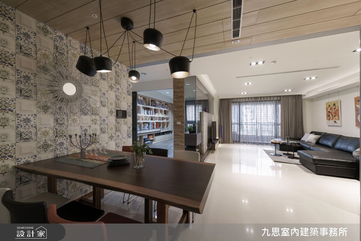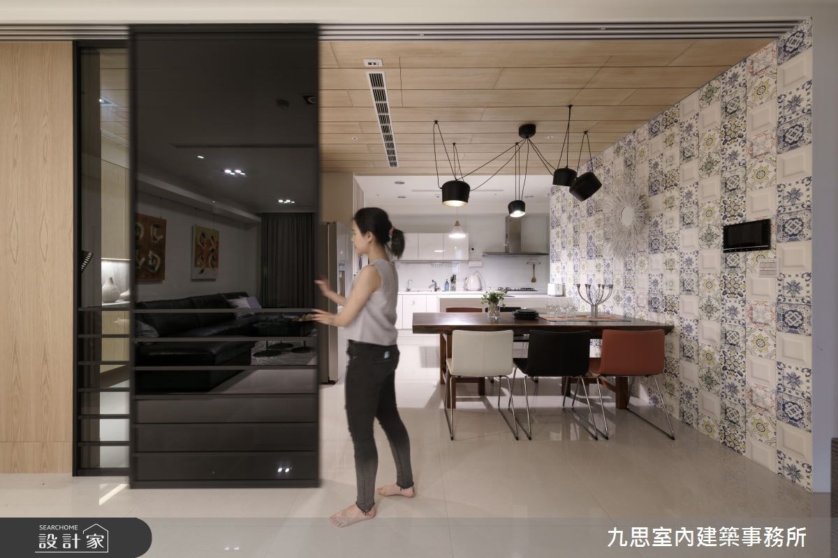 玄關區域,兩側立面、天花和屏風精心選用無毒、防水的木質材鋪敘,建立溫暖舒適的第一印象,同時賦予充沛的收納機能,更除去穿堂煞的風水疑慮。公領域採開放式格局,放大空間視覺感,並巧用鏡面拉門,使客、餐廚區域彼此獨立,卻又能相互串連,映照豐富而彈性的生活機能。電視牆結合書房隔間,混搭玻璃質材和大理石,拋開實體隔間的沈重感,而藏書背景恰為最獨特的居家語彙。走入餐廳,絕美花磚、木質天花、幾何線性燈具相互映襯下,以立體家飾為主體,創造初優雅而富含質感的用餐場景。