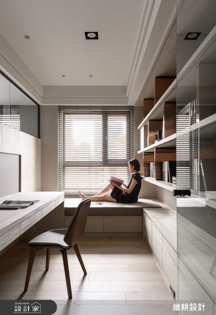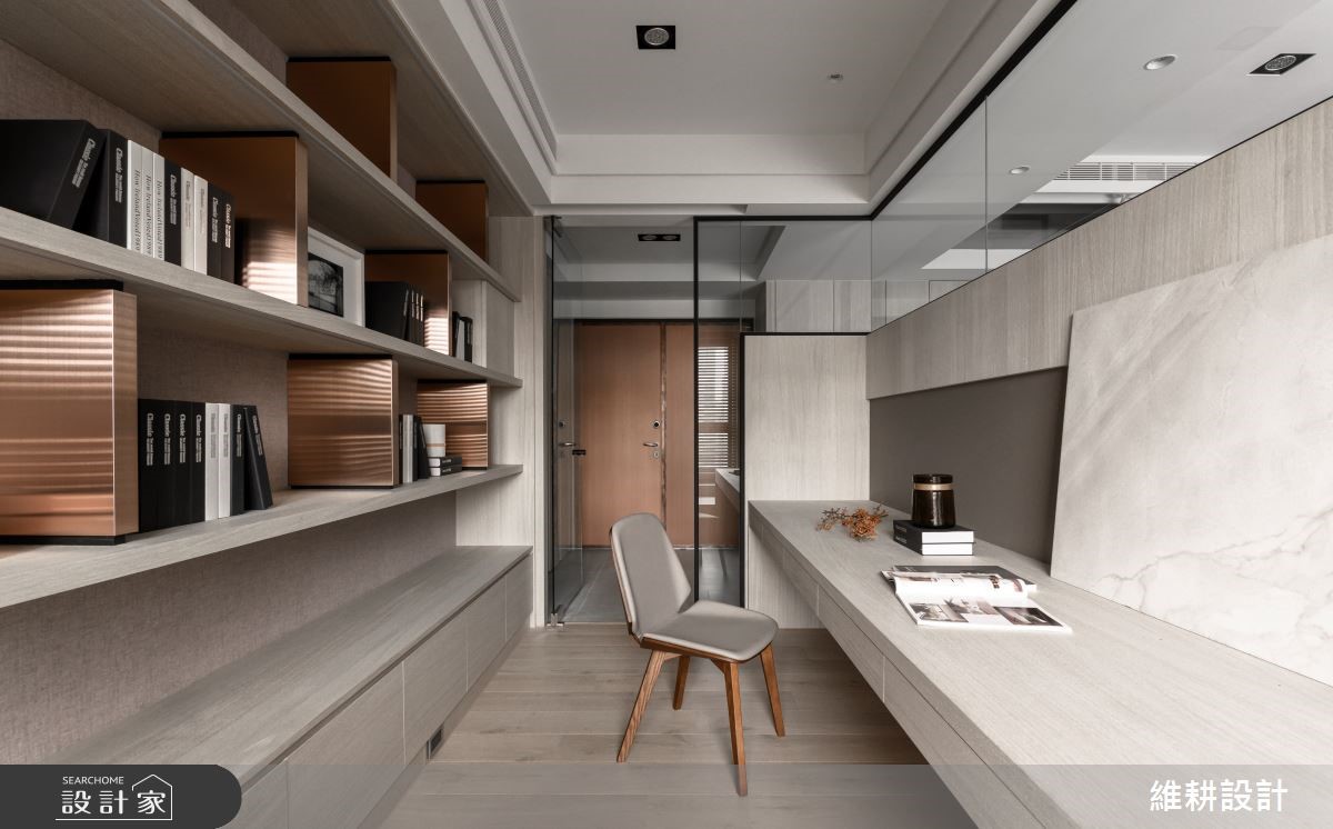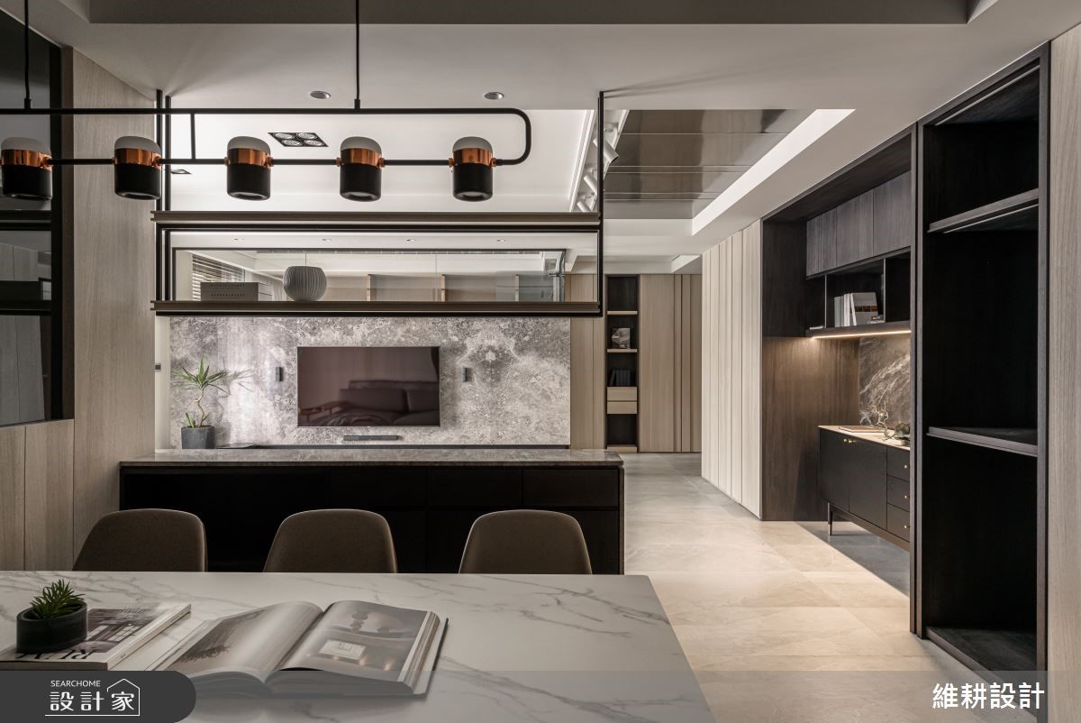 格局分配上,妥善配置書房、客廳、餐廳等位置,並以同材質串聯立面與門片,展現俐落整齊的視野,且在局部天花板鋪陳金屬材質,衍生空間放大感,建材上採用石材、實木皮、玻璃、鏡面、鐵件等,營造敞亮、溫潤又沉穩的生活領域;並運用玻璃界定餐廳、廚房,讓彼此保有穿透串聯,同步分野場域,圍塑出明亮淨透的情境;開放式書架採用鍍鈦隔屏增添細緻度,滿足親子共讀的美好光景,同時配置臨窗臥榻,引日光入室,讓書房兼具客房功能,提供彈性使用;主臥內,則引用內斂的灰階色彩,搭配溫煦木地板,創造優雅舒適的氛圍!