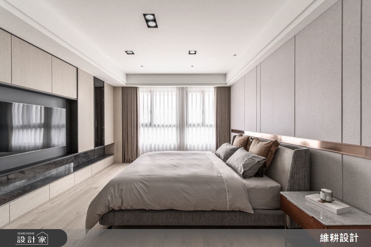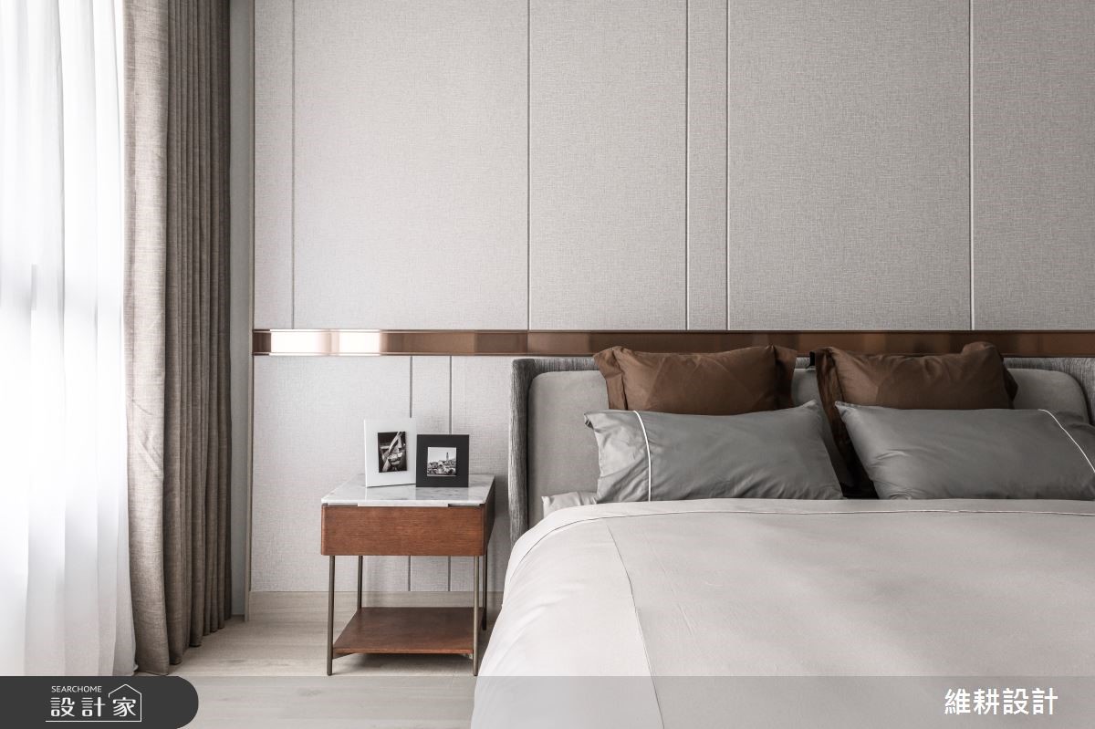 主臥床頭牆以淺灰為背景,中央嵌入鍍鈦金屬帶條,以精工細節體現設計之美!