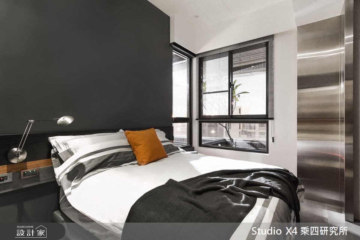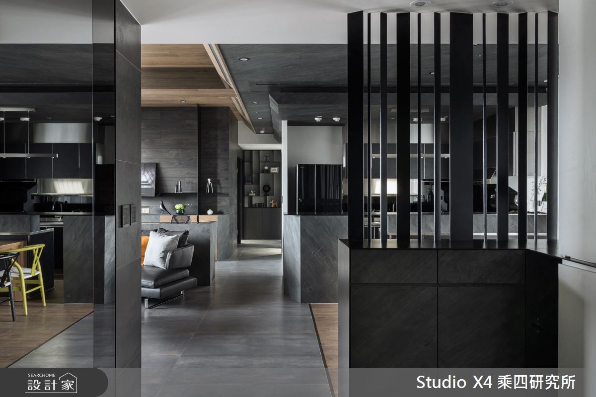 打開大門入內,半牆搭配格柵型塑完整落塵區,而不規則方向的鐵片格柵設計則巧妙遮掩餐區,化解風水忌諱,並以此帶出空間序曲。室內以沈穩的深灰色作為空間主調,並運用不同深淺素材豐富層次,呈現同色系卻不同建材的多元肌理。開放式的客餐廳,客廳以木皮天花、板岩地坪營造現代利落感,而廚房與餐廳則完全相反,以木地板賦予暖心踩踏,也巧用建材的倒置界定場域。轉入私領域,延續公共空間不同建材的搭配元素為大成,床頭牆面以深淺木材、板岩、金屬線條交織演繹設計,而更衣室則利用可調整透明度的玻璃,在視覺延伸與隱私中取得平衡。