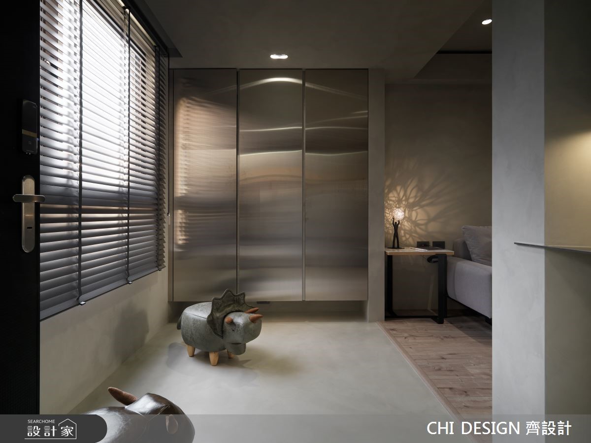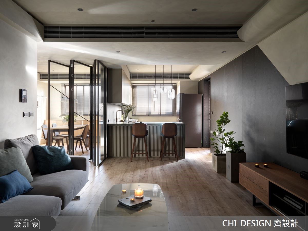因考量到開門見窗的疑慮,配置半開放玄關,選擇金屬材質打造鞋櫃,映照出視覺寬敞度,透過金屬髮絲紋構成亮點;並考量到空間感狹長,將廚房轉化為開放格局,把餐廳跟書房做結合,形塑更大空間感,且在客廳主牆加入一道斜線,運用特殊塗料樂土、以黑灰白建構獨特表情,帶出仿清水模的紋理質感,簡單中富有個性,牆面左邊則選擇大板磁磚,呈現破裂紋的細緻紋路;同時讓廚房及客廳形成串聯、增添互動感,沿用電視牆材質鋪敘廚房壁面,並規劃藏有收納玄機的多功能吧檯,體現設計巧思,而鐵件展示層板、手吹玻璃燈等,更展示出了溫暖跟趣味;多功能場域則安裝折門,當收納起來時,整體可變得開闊,開啟時化為斜線線條,與電視牆形成呼應!