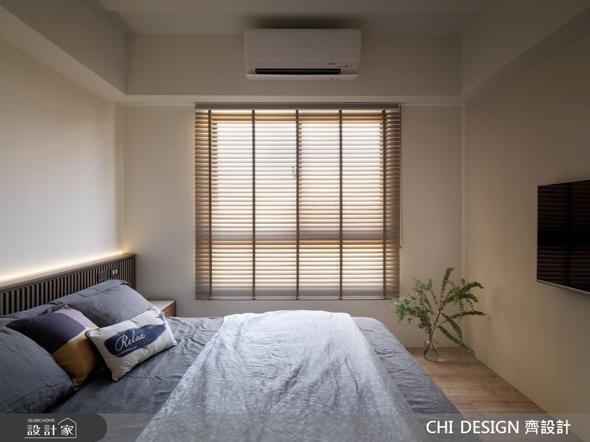主臥選用柔和淺色做主題,藉由床頭格柵畫龍點睛,衛浴則經過改建,呈現飯店般的時尚韻味,特地於門檻暗藏排水孔,顯現貼心的設計細節!
