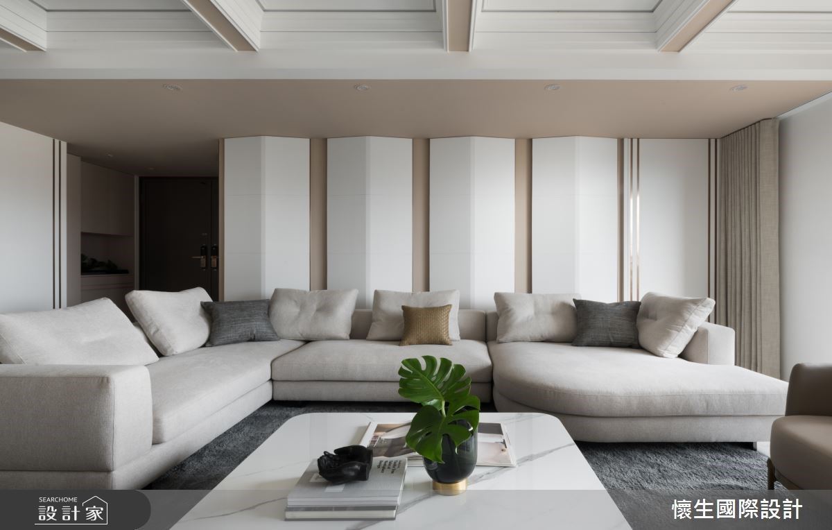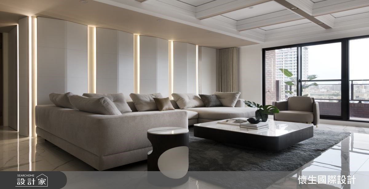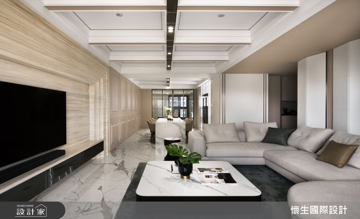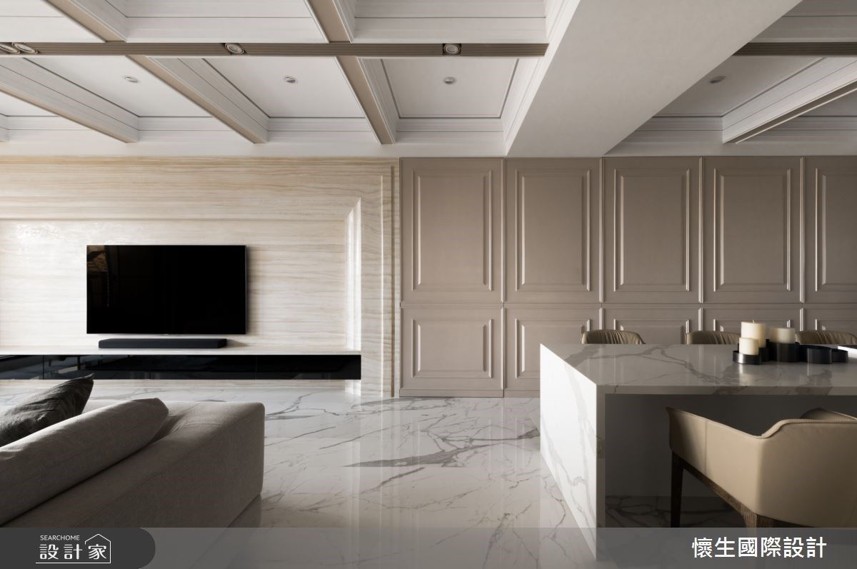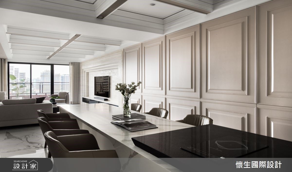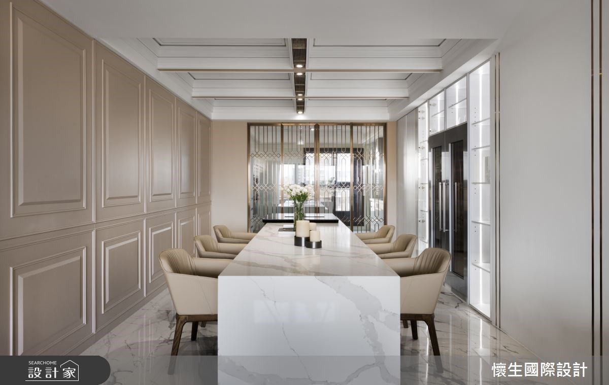空間裡巧遇大樑結構,透過格紋造型天花的安排,串連照明設計,視覺一路延伸至窗外,呈現出開闊氣度。白色大理石鋪設公領域地坪,淡雅的紋理流露出藝術風采,隨著光灑落其中,流露明亮潔淨之意。電視牆以漸層門拱造型的米色大理石擘劃,淡雅的紋理呼應地坪的藝術感,傳遞自然之意;沙發背牆以弧形立面打造,底部搭配間接照明,形塑一道光牆,夜晚時開啟,更感受到溫暖與情調;電視牆一旁串連整排以線板描繪的櫃體,滿足屋主對收納的實用需求,循著規矩與充滿秩序的美學視覺,我們來到餐廳空間裡,中央擺設大型的石材餐桌,可容納多數親友一同共乘,並享受佳餚的美好;冰箱的周圍則結合展示櫃,陳列著屋主收藏,讓家屋增添美學的優雅與質感。