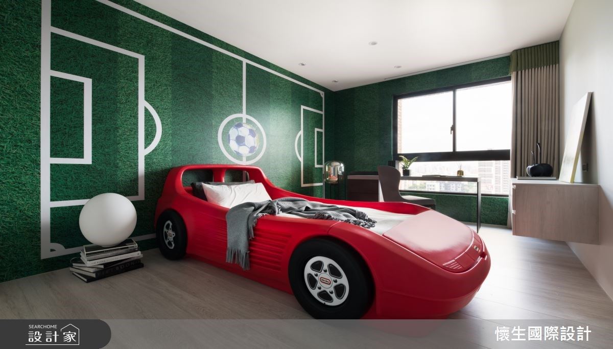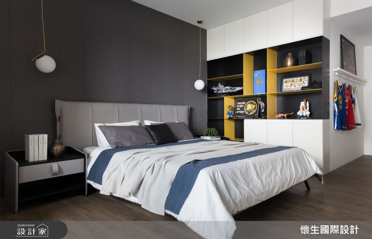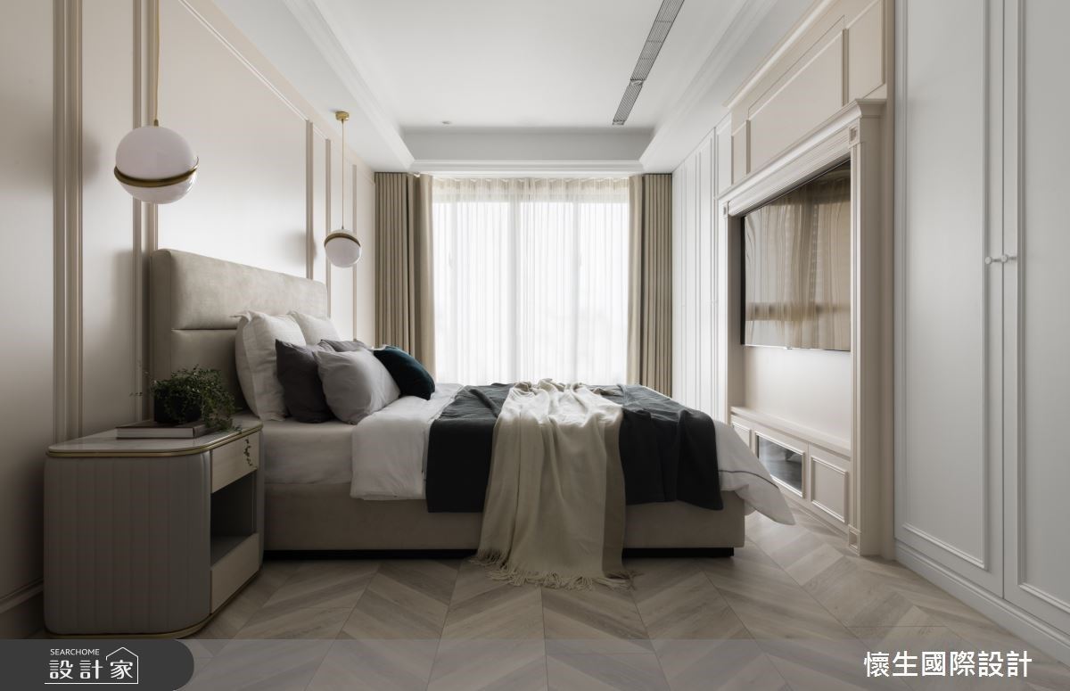 主臥室裡,安排米色床頭牆鋪設,兩側以半球體搭佐細緻金屬的吊燈點綴,形塑溫潤、柔和的休憩氛圍;一旁則以玻璃拉門界定更衣室,滿足屋主對美的需求,而穿透的視覺讓空間更顯開闊、舒心。