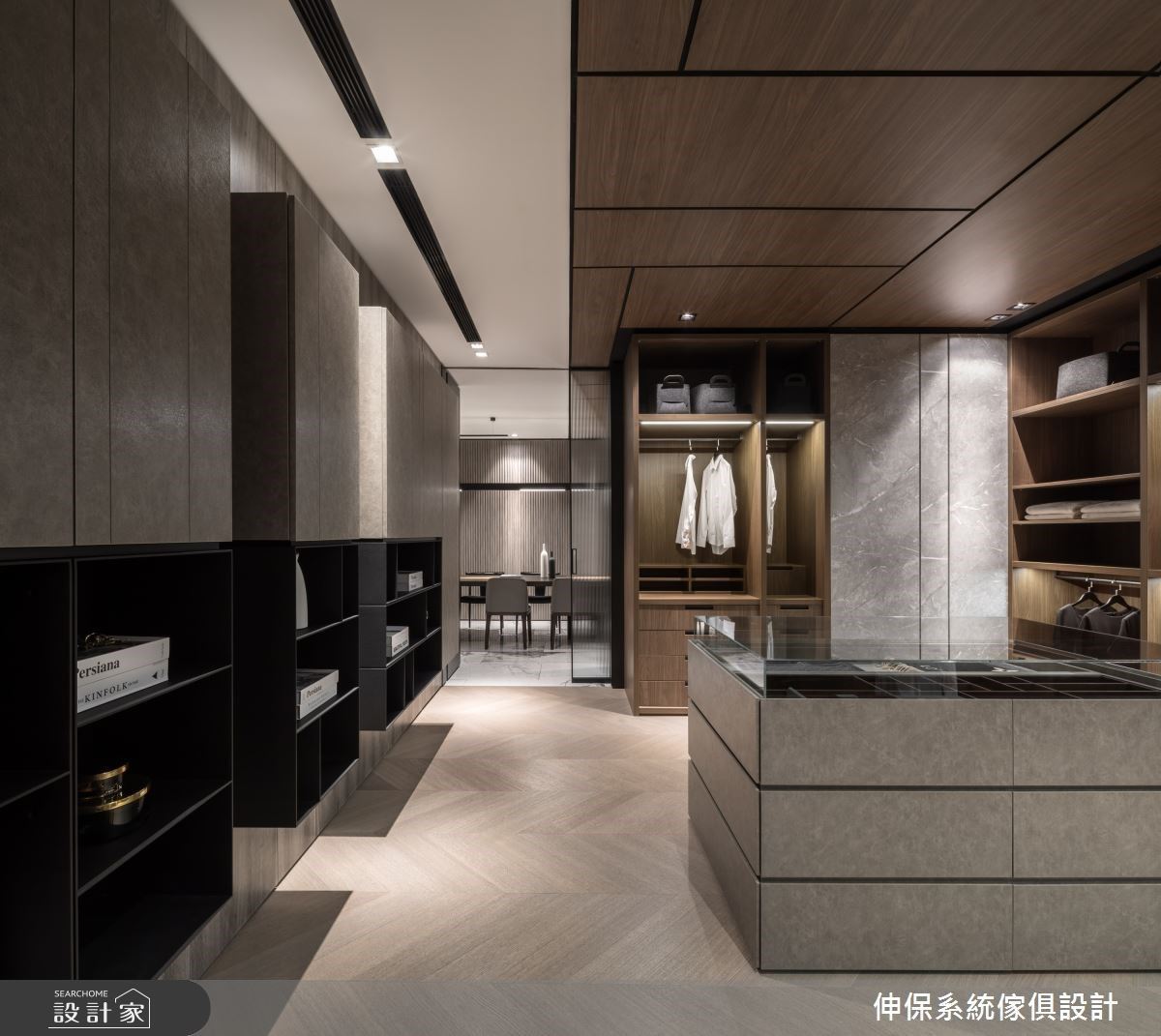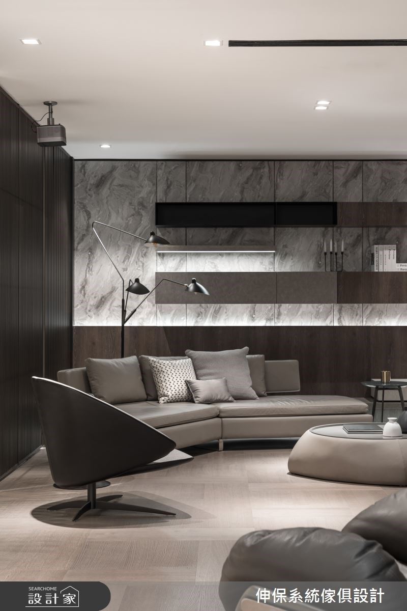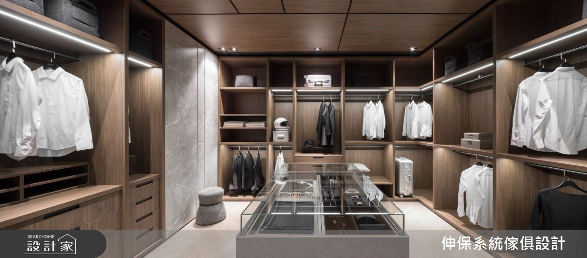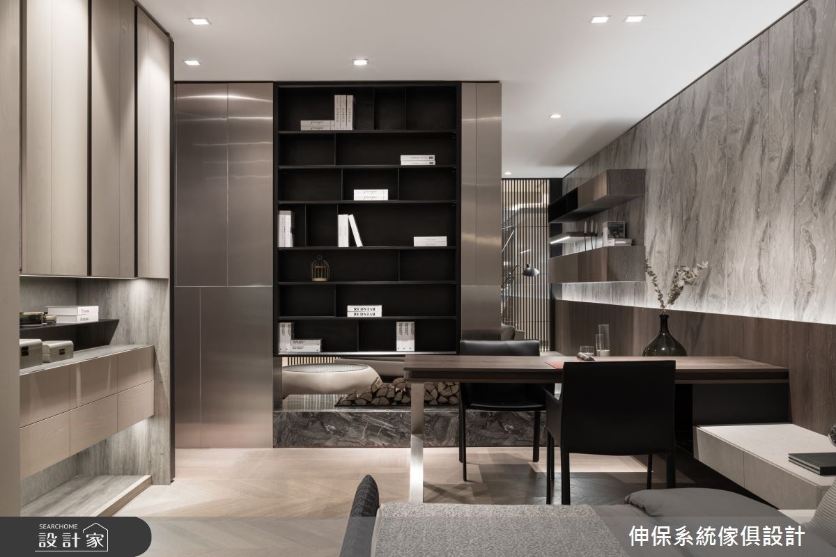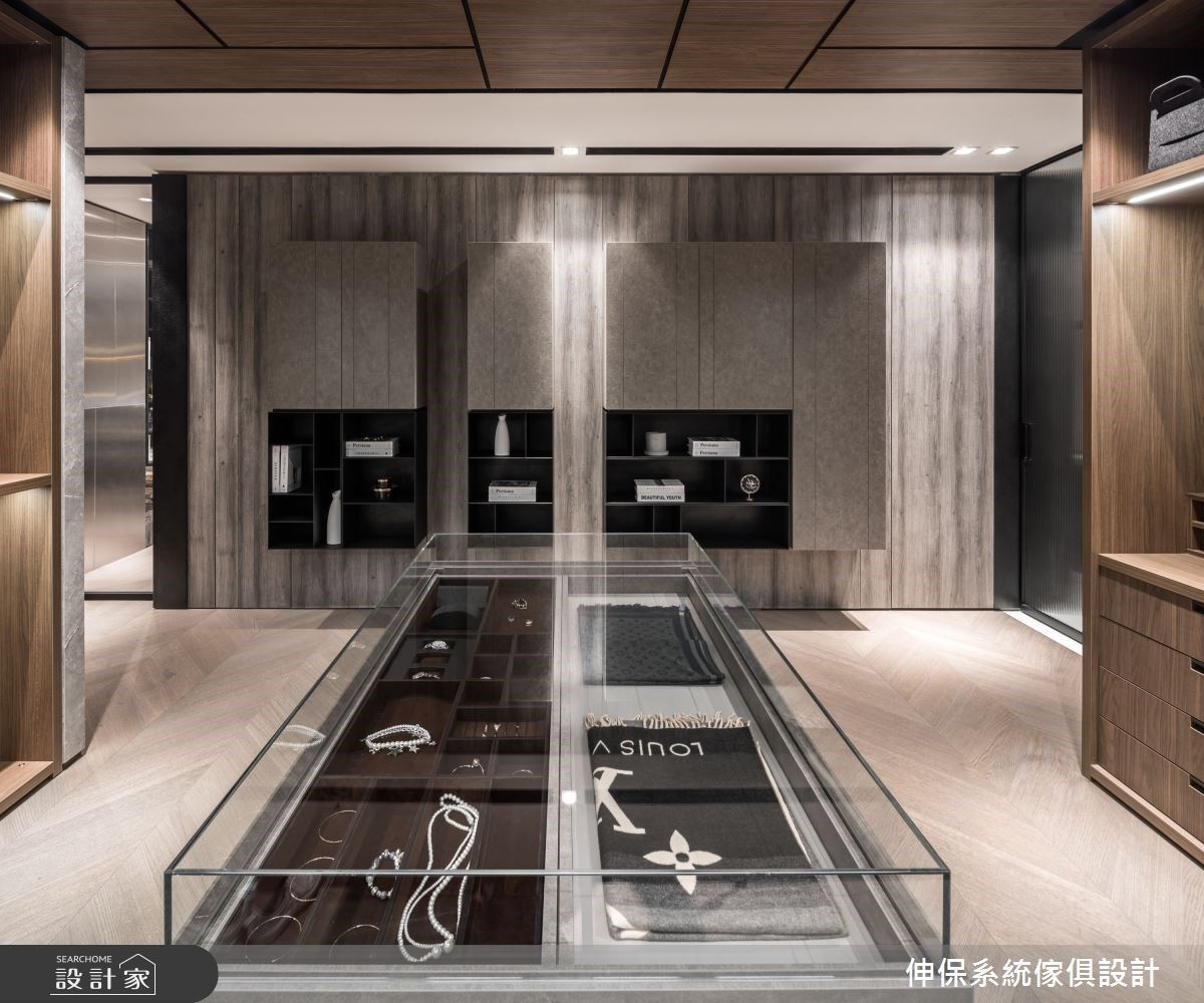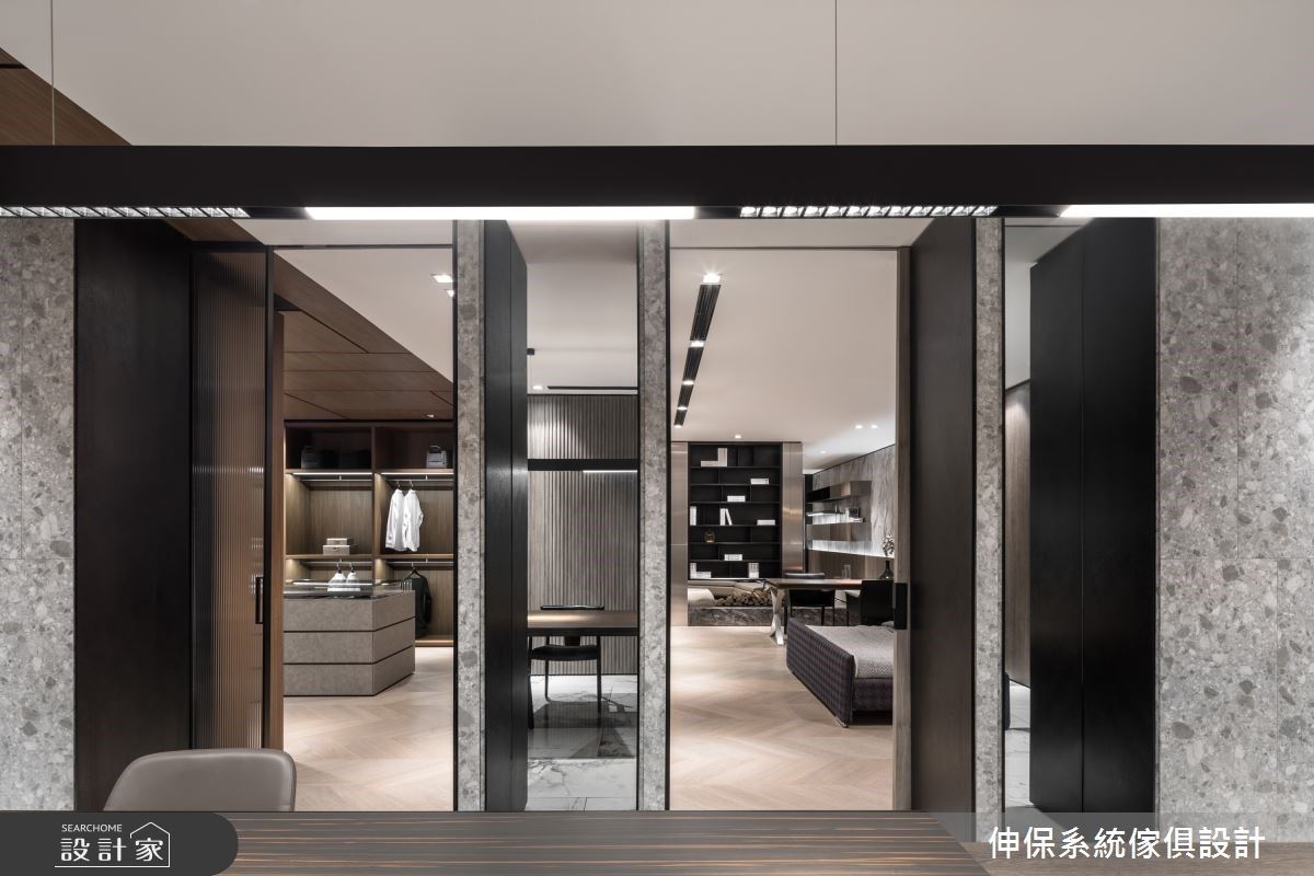 入口處,透過大理石材感的板材烘托LOGO主視覺,層板與木紋質感的櫃體營造出活潑不呆板的時尚感,搭配皮革單椅、弧形小茶几,形塑一面端景視覺;入口左側則以格柵造型界定內外領域,隱隱約約的視覺讓空間保有穿透,同時達到劃分空間的效果。格柵的後方空間,壁面結合大理石紋理以及木紋的妝點,搭配展示機能的設計,冷暖特性相容,伴隨沙發、茶几的安排,創造出漸層的視覺美感;另一側則搭建金屬板的壁面風格,挹注前衛的時尚之美。循著廊道走進室內空間,走道上以懸空的收納櫃安排,下方黑色展示層板結合上方灰色櫃體,營造出低調內斂的高雅質感;更衣室空間裡,大量的木紋做為衣櫃基底,嵌燈串連其中,衣服清楚的展示出來,宛如時尚精品般的展示著屋主自身品味;另一側則分別以玻璃、木紋拉門界定出公領域與餐廳空間,隔間牆串連穿透特質與溫潤感受,體現家可以擁有靈活多樣的設計風貌。