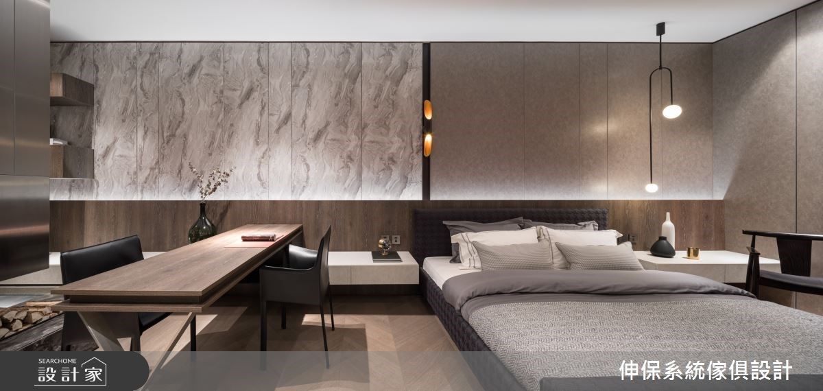 臥室裡以開放的空間規劃,木紋、灰色調的色系為基礎,壁面中央以深色木紋串連領域機能,上方牆面則藉由不同的視覺變化來劃分出床與書桌領域,讓空間保有彈性與機能。