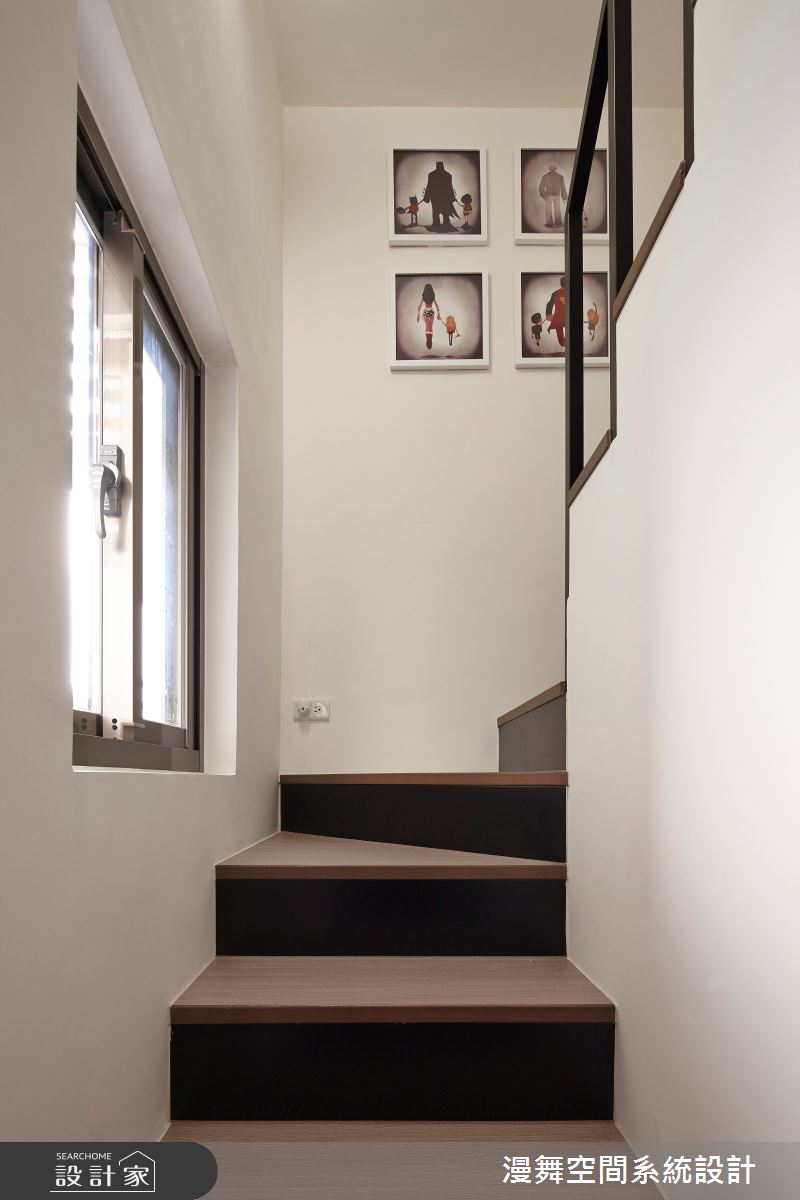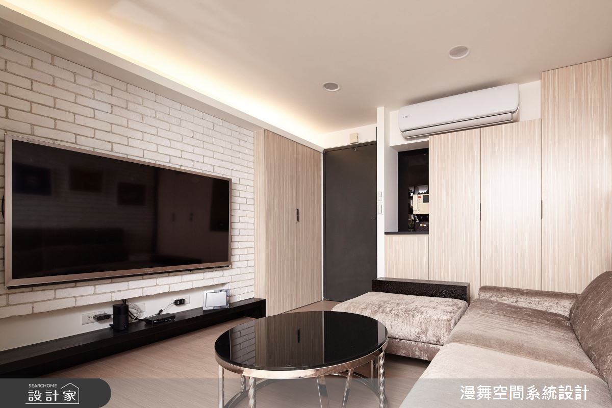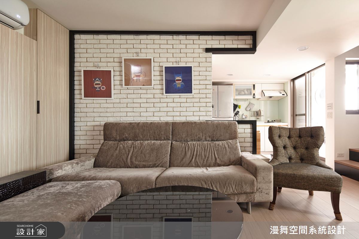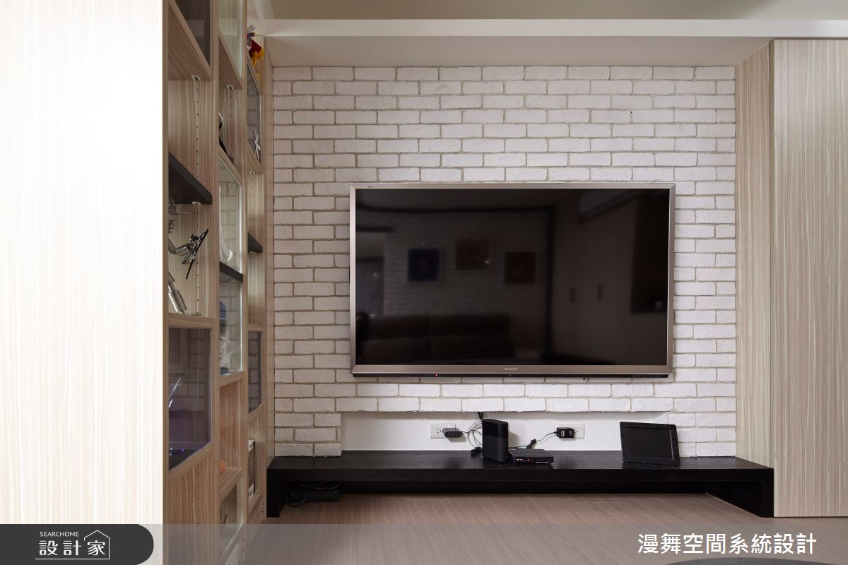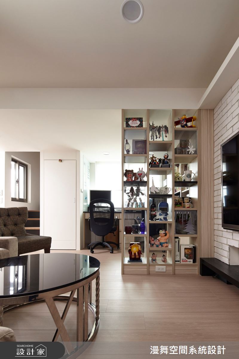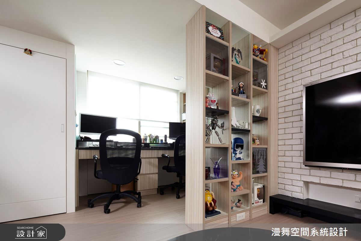 在客廳處,電視與沙發背牆面均使用文化石,並將文化石牆的水泥混和調色,以淺灰色的基底與文化石搭配,呈現無需刻意雕塑的自然質感,十分率性,並運用深色的木皮外框包覆文化石的沙發背牆,中間保留一道缺口,既是造型,也可以用來擺放物品,對於空間達成光線流動的效果;在書房與客廳之間,則利用系統家具規劃一個雙面展示櫃用來置放公仔,運用灰玻璃、清玻璃展現不同的鏡面效果,讓櫃體造型變得更有趣,同時達成放大穿透的空間視感,且串聯書房的書櫃動線,輕鬆完成半開放式格局!