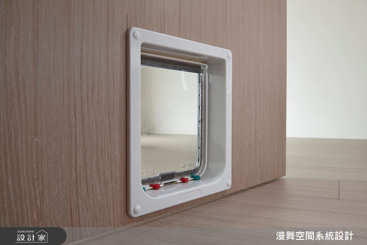 臥房空間,因考量到屋主愛貓,所以在房間門下方加入貓咪通道的寵物門設計,讓貓寶貝可以自由進出溜達,也在隔音處理上下了許多功夫,像是在夾層中間皆加入隔音墊,讓寢臥保有舒適安靜的氛圍。