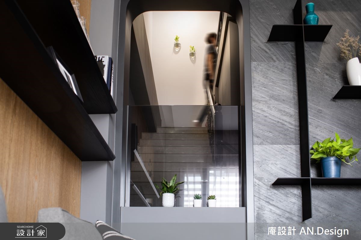 居家以冷冽的鐵灰色與溫暖的木質調,迸發沉穩優雅的生活氣質,而木百葉調和了恰好的陽光比例,緩慢地向每一個空間格局邁進。客廳除了木紋沙發背牆的層板外,靠近樓梯間的石板牆面上,也採取縱橫交錯的展示架設計,就像是攝影格線般創造專屬的空間構圖。另外,挖空牆面也解放客廳的侷促,打開視覺的立體感受,增添日常的活潑趣味。