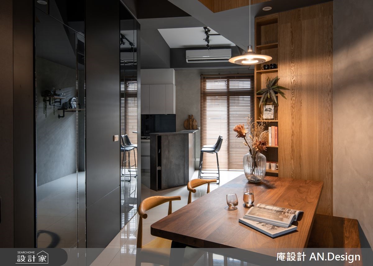 餐廳以傾斜角度安排桌椅,搭配鏡面放大空間尺度,使動線更加順暢,不會影響正在用餐的家人。廚房規劃粗獷的造型吧檯,映著午後的和煦日光,讓人可以在此邊翻閱攝影作品,邊品嘗醇厚的咖啡口感,享受職人手沖咖啡廳般的愜意。主臥運用珪藻土妝點牆面,帶來細膩的手作質感,並結合芥末黃搖椅跟碧綠色立燈,打造不同公領域的清新氛圍。