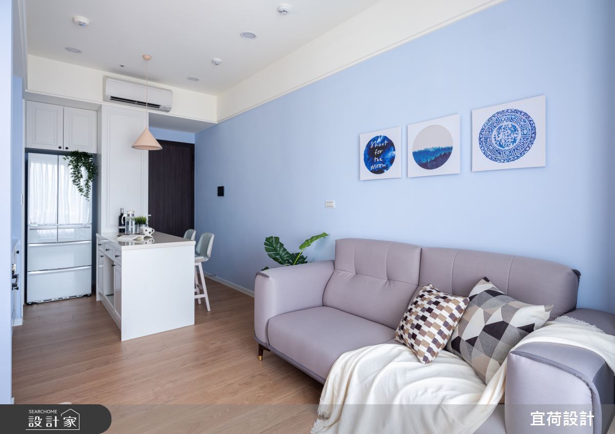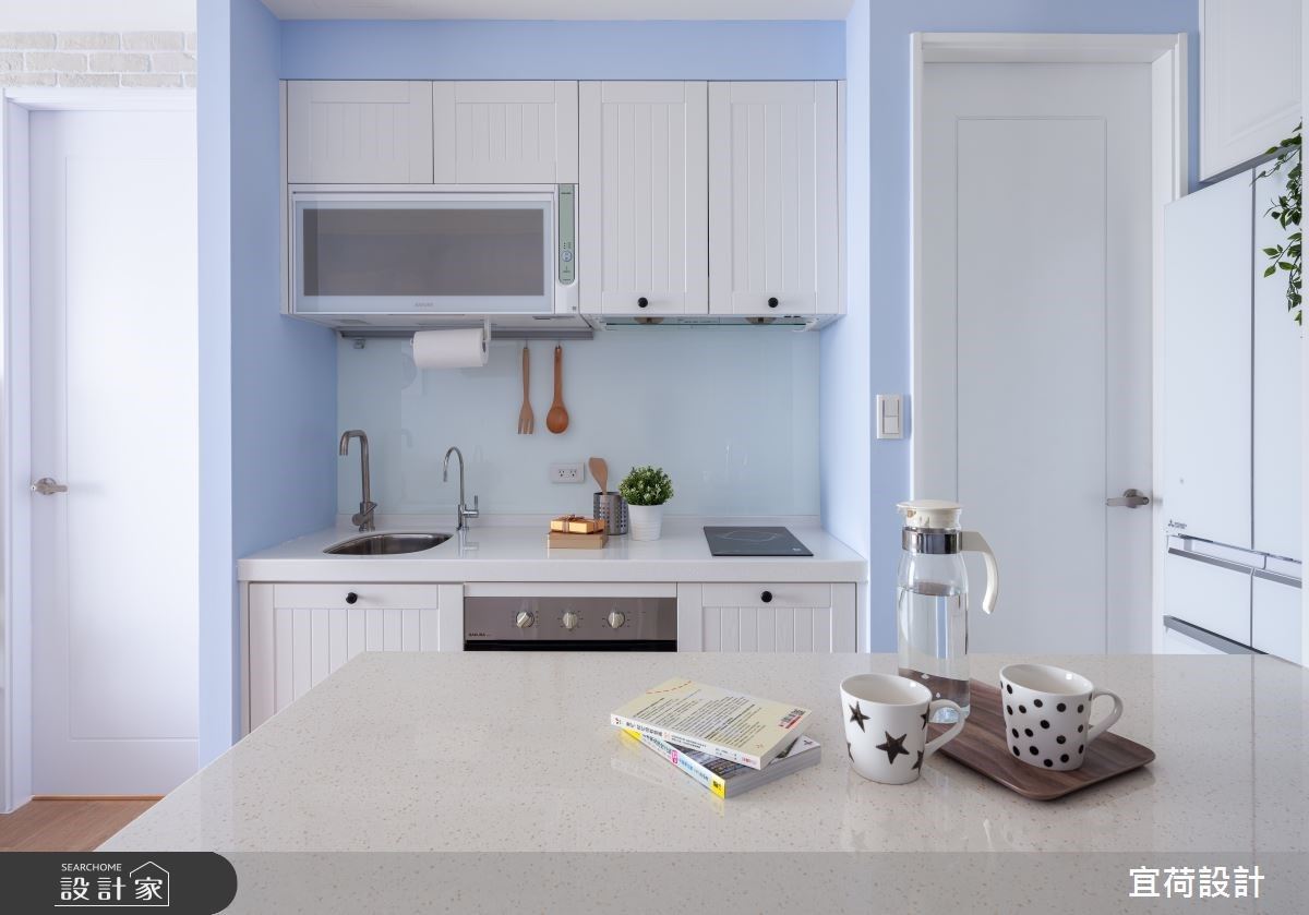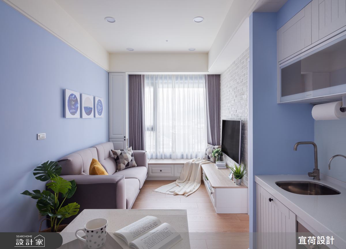 客廳透過窗面將日光自然導入室內,襯佐幾株綠植妝點,讓人走進屋內即感受到明亮溫暖的氛圍,並在立面揮灑淡淡的灰藍,給予適度留白,將藍天白雲意象納為屋中一景,沙發牆裝飾幾幅畫作,讓視覺多了聚焦的主題,少許的木紋與文化石點綴,則讓舒適氛圍更為沉澱;並在有限坪數內,滿足主人的收納需求,像是在靠窗區域打造收納臥榻,營造簡約的多功能休憩角落,旁側更善用坪效,安排柱體式櫃體,創造好用的儲物空間;小巧廚房收整在餐廳旁側,配置齊全的廚具設備與收納櫃,以輕巧吧檯取代制式餐桌,為公領域創造更方便的機能性!