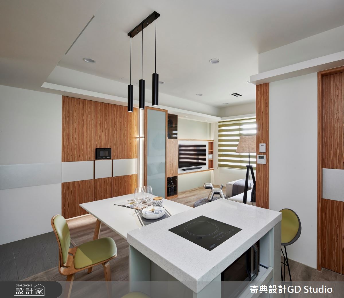 玄關區,以部分造型櫃作為隔屏,並以十字架間接燈光作為端景,帶出女屋主專屬的信仰精神,整體風格採以日式簡約的線條為主,搭配木質建材、玻璃鐵件等結合,使空間具有家的溫度,且也重視分區與隱藏收納的功能性;同時規劃兼具禱告與書房功能的場域,與主臥同一入口,讓使用者不論位在的書房或臥室,仍可有身處同一空間的陪伴感受,並增加大型臥榻與藏書文件櫃與事務機置放處,滿足不同時段的不同需求;半開放式廚房,與客餐廳呈現流暢的空間互動感,且在臨接的餐廳處配置小中島櫃,配置烤箱、微波爐、電陶爐等設備,加強廚房的延伸功能,並藉由中島餐廳區的規畫,讓餐廳動線呈一回字型,形成更靈活的動線;男孩房原有空間稍小,將走道往左挪45公分,讓臥房增加空間量,並善用走道空間,為男孩房及主臥規畫供兩房使用的儲藏櫃區,用以增加收納功能!