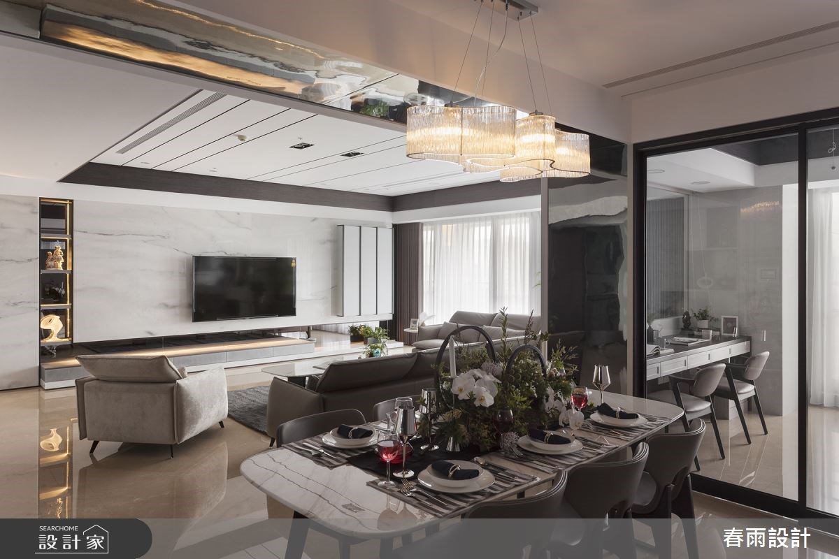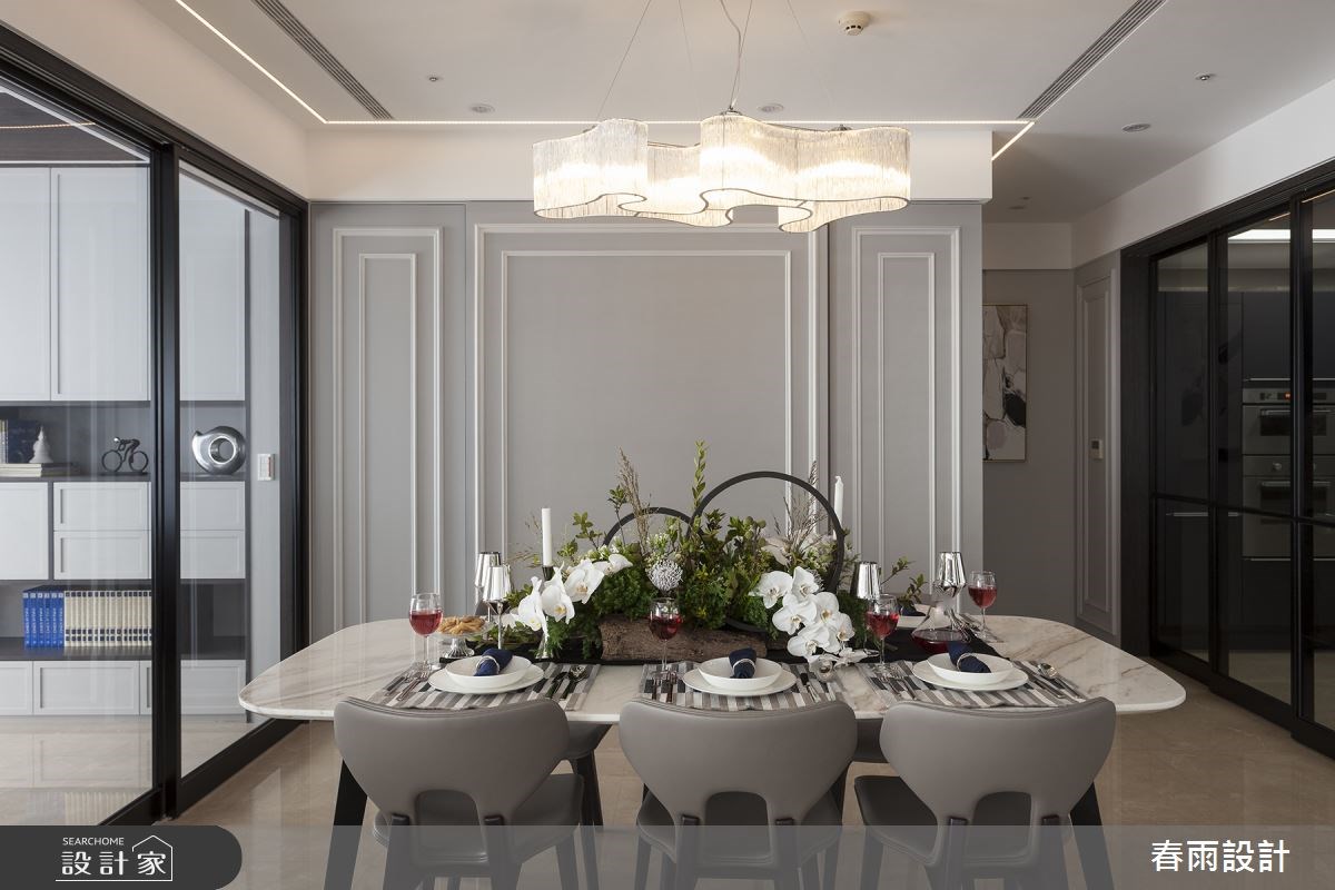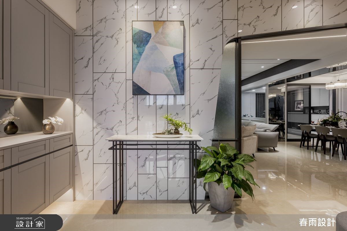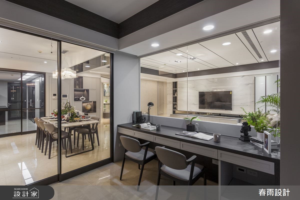 甫入玄關,拼貼大理石牆為底,在掛畫與植栽陪襯下形塑端景牆面,並以鏡面與線板元素延伸入內,演繹多樣化神采替空間揭開序幕。方正、敞亮的公領域,天花板利用線條拉開空間尺度,間距不一恰恰帶來活潑的節奏感;米色、褐色、棕色的軟性家飾,則帶來中性沈穩的溫暖氣場,和餐廳背牆成為最佳呼應,大理石餐桌和燈飾更使流露微奢氣氛。書房區域,以玻璃結合線板打造輕隔間,援引光線入室,保留開放性的視野,卻又創造保留隱私的獨立場域。
